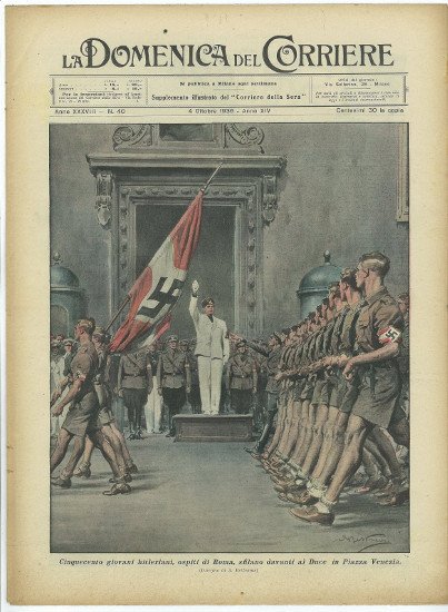Fascicolo originale e completo. Disegno di A. Beltrame. - Cinquecento giovani hitleriani, ospiti di Roma, sfilano davanti al Duce in Piazza Venezia.