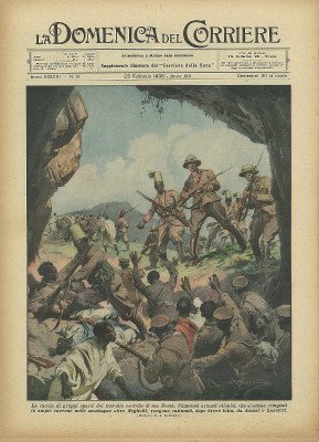 Fascicolo originale e completo. Disegno di A. Beltrame. - La caccia ai gruppi sparsi del travolto esercito di ras Destà. Numerosi armati etiopici, che si erano rifugiati in ampie caverne nelle montagne oltre Neghelli, vengono catturati, dopo breve lotta, da Ascari e Lancieri.