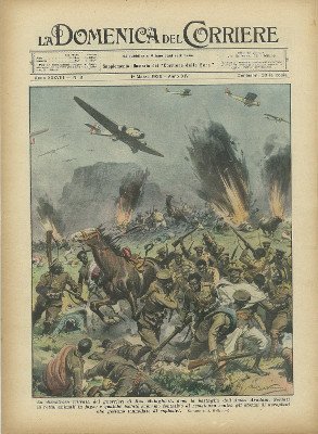 Fascicolo originale e completo. Disegno di A. Beltrame. - La disastrosa ritirata deI guerrieri di Ras Mulughietà, dopo la battaglia dell' Amba Aradam. Soldati in rotta, animali in fuga; e qualche isolato supremo tentativo di resistenza contro gli` stormi di aeroplani che gettano tonnellate di esplosivi