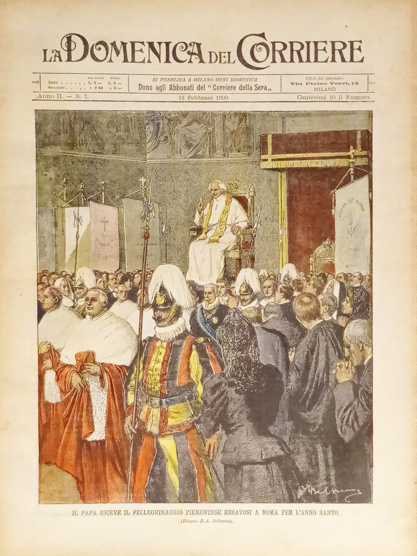 La Domenica del Corriere N. 7 - 1900 Il Papà riceve il pellegrinaggio piemontese Testo in lingua italiana. Pagine 16 con illustrazioni Condizioni molto buone con piccoli segni del tempo come da foto. Â