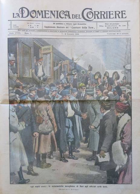 Milano, Corriere della Sera, 1916. Anno XVIII. Annata quasi completa, dal 9 -16 gennaio 1916 al 17-24 dicembre 1916 (mancano i numeri 2 - 52). Vol. in folio, composto di 50 fascicoli su 52, ciascuno di essi costituito da 15 pp. circa, vecchia leg. in mz. tela color vinaccia con piatti in cartonato marmorizzato in rosso nero, titolo e anno in oro al dorso, prima di copertina sempre disegnata e illustrata a colori, numerosissime ill. in b/n e a colori, relative ai più importanti accadimenti dell'anno, belle inserzioni pubblicitarie in fine. La celebre rivista “La Domenica del Corriere. Supplemento illustrato al Corriere della Sera”, uscì a partire dal 1899. Dalla presentazione: “Se dovessimo raccogliere in una sola sentenza le nostre intenzioni, diremmo: Vogliamo fare un giornale illustrato che non somigli agli altri. Quest’è, lo ammettiamo, una molto audace ambizione; ma se fossimo venuti al mondo unicamente per correre nel solco già aperto da altri, non meriteremmo incoraggiamenti”. Inizio così, con questi propositi, quello che divenne il più noto e popolare settimanale di attualità e cultura d’Italia, e ciò grazie alla direzione, alla scelta dei collaboratori, e alle tavole a colori che, per oltre cinquant’anni, furono disegnate da Achille Beltrame e dal suo successore Walter Molino. In buono stato di conservazione.