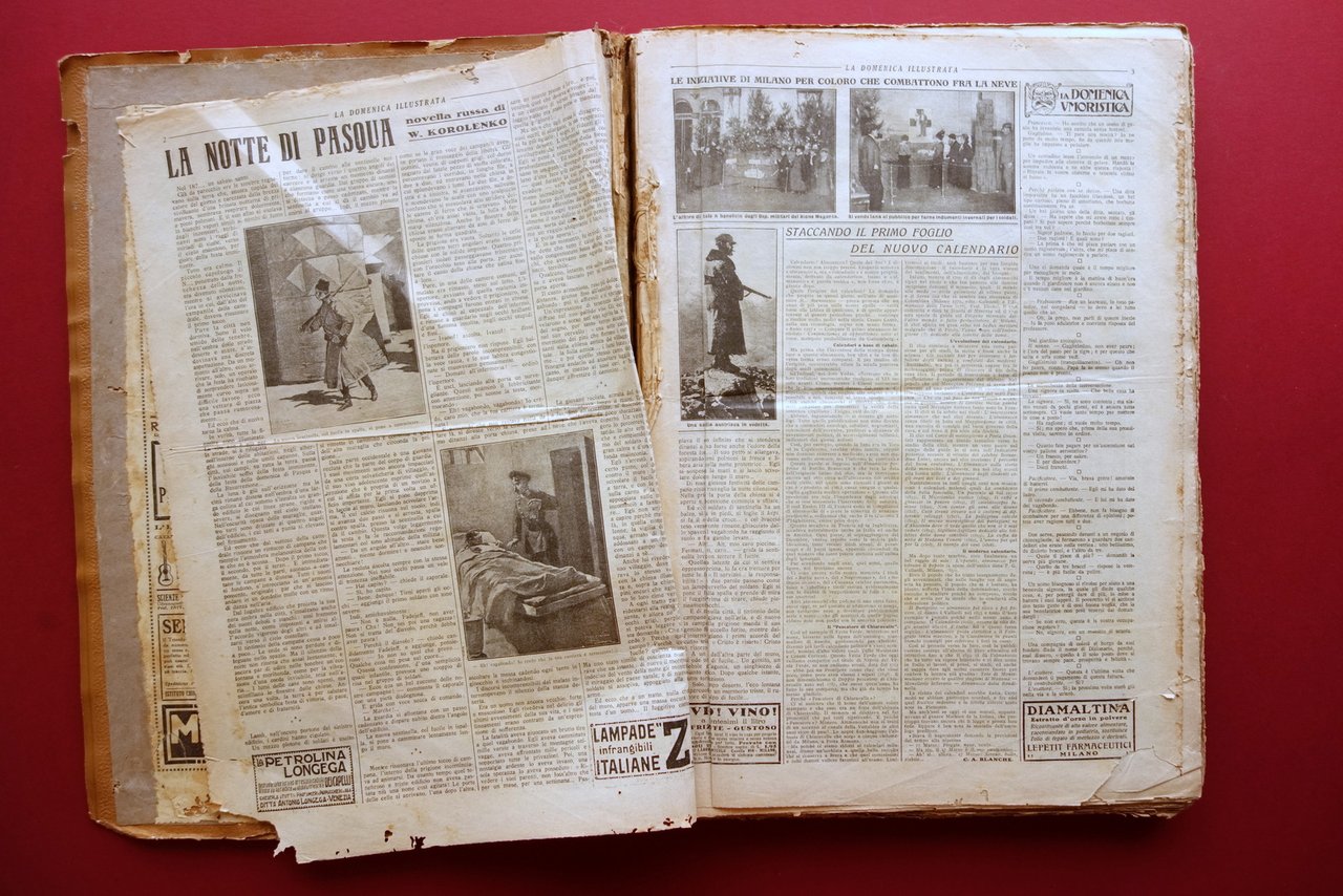 51 numeri di giornale (settimanale), † La Domenica Illustrata" periodico settimanale anno III - 1916 51 numeri dal 2/1/1916 al 31/12/1916 tutti dedicati alla Grande Guerra annata completa del 1916 Sonzogno, Milano 1916; pp. circa 8-8 per ciascun numero, con varie ill. fotogr. in b/n nel t.; copertina e ultima pagina di ciascun numero con bella ill. a colori a piena pagina (vedi foto); 51 numeri completi inseriti entro legatura d'epoca artigianale in cartonato muto. Annata completa del 1916. † Condizioni di conservazione Esemplare in condizioni pi˘ che discrete con tracce d'uso, qualche brunitura, coperta con alcune piccole / circoscritte mancanze ai margini e agli angoli; lievi ondulazioni e tracce / lievi gore di vecchia umidit‡ che non interessano gli interni (vedi foto); dorso con strappetti anche di alcuni cm. Alcune pagine con minimi difetti, strappetti e/o sgualciture ai margini; copertina ant. del numero 1 e quella post. del numero 51 con qualche marginale mancanza e tracce di pieghe. Cerniere interne con rinforzo artigianale in carta (vedi foto). † 51 numeri, tutti dedicati alla Grande Guerra. Ricchissima fonte di notizie e informazioni sui vari fronti di guerra, le battaglie, gli umori, ecc. A pagina 3 del settimanale numero 38 una curiosa sequenza fotografica di tre ballerini intenti in danze futuriste (vedi foto). Ad eccezione del primo e ultimo numero, maggiormente soggetti a usura, gli altri sono tutti in buone condizioni (vedi foto e descrizione). † SETT209.L19397 N "