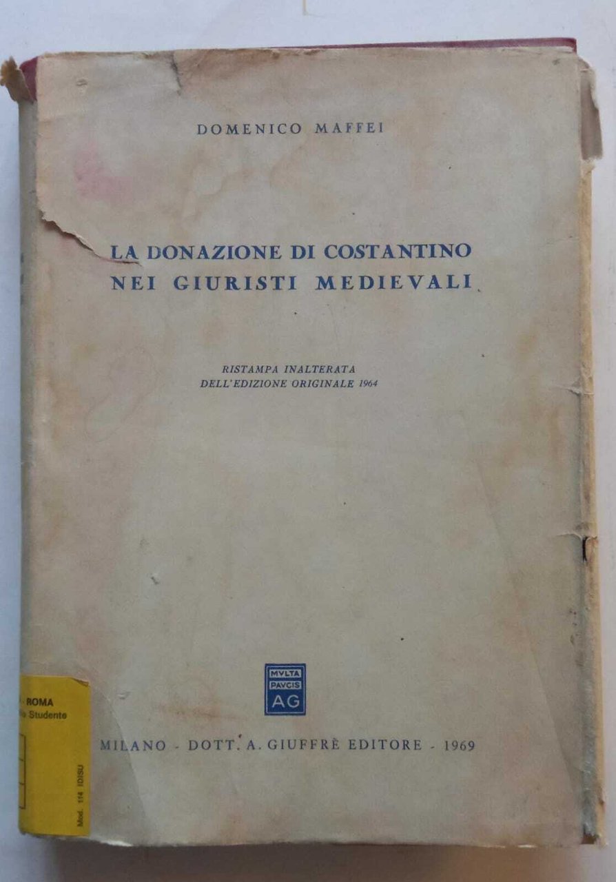 La donazione di Costantino nei giuristi medievali, ristampa inalterata dell'edizione originale del 1964. La sovraccoperta editoriale con tagli e mancanze e la copertina editoriale uso tela sono macchiate da una pregressa umidità, le pagine invece sono pulite e ben tenute. Il volume riporta timbri di proprietà. Copia dismessa. 366 Buono (Good) .