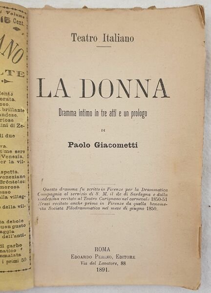 Edizione del 1891 della commedia "La donna" del commediografo Paolo Giacometti (1816-1882) nato a Novi Ligure. Giacometti si trasferì a Genova un anno dopo la sua nascita. Note manoscritte. In buone condizioni. Copertina editoriale in buone condizioni generali con lievi usure ai margini e dorso. Legatura in buone condizioni. All'interno le pagine si presentano in buone condizioni con fioriture. In 16. 17x11 cm. Pp. 61.Edition of 1891 of the theatre play "La donna" byt he playwriter Paolo Giacometti (1816-1882) born in Novi Ligure. Handwritten notes. Editorial original cover. In good conditions. Editorial cover in good general conditions lightly worn in the extremities. Binding in good conditions. Inside pages are in good conditions with foxing. In 16. 17x11 cm. Pp. 61.
