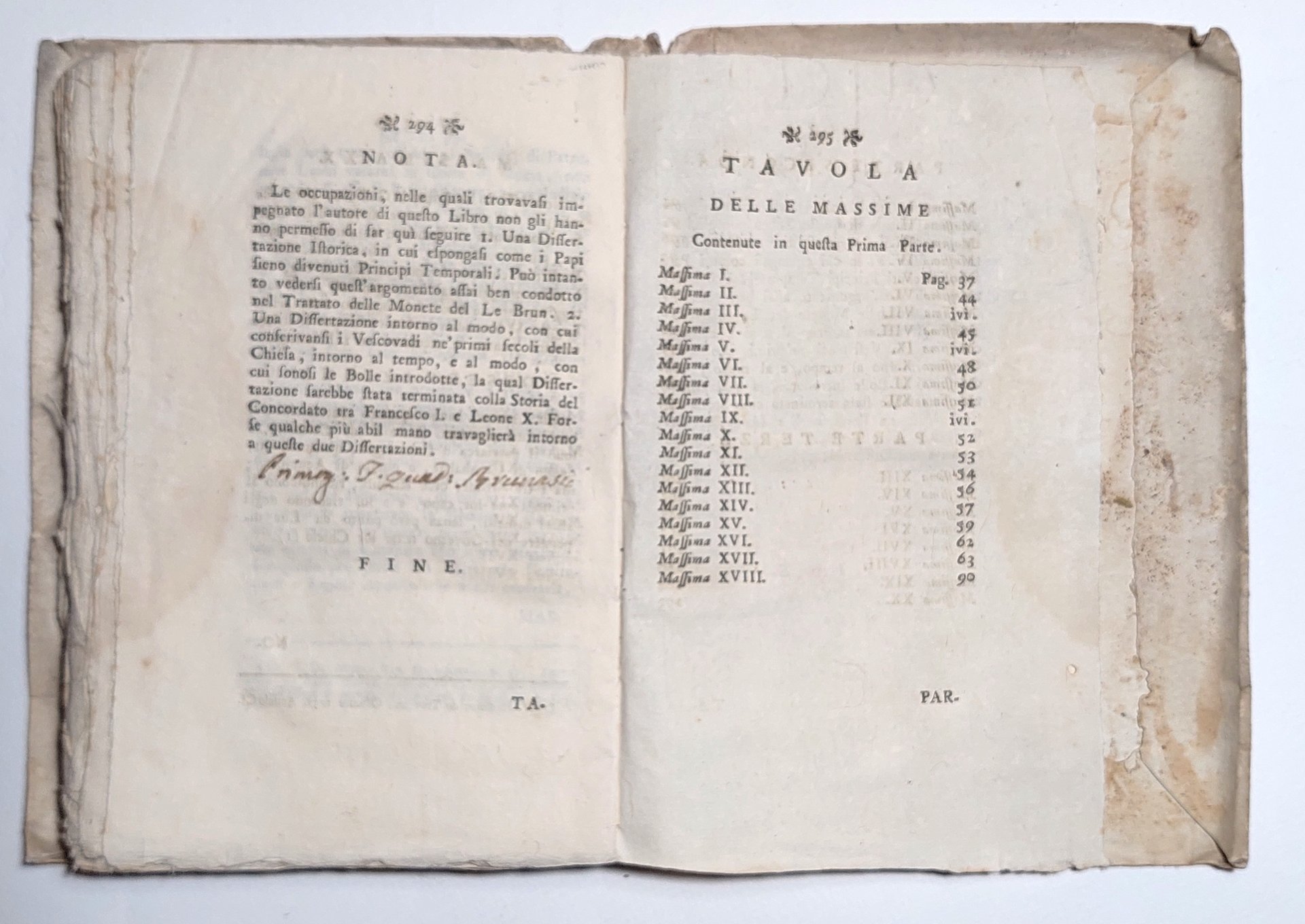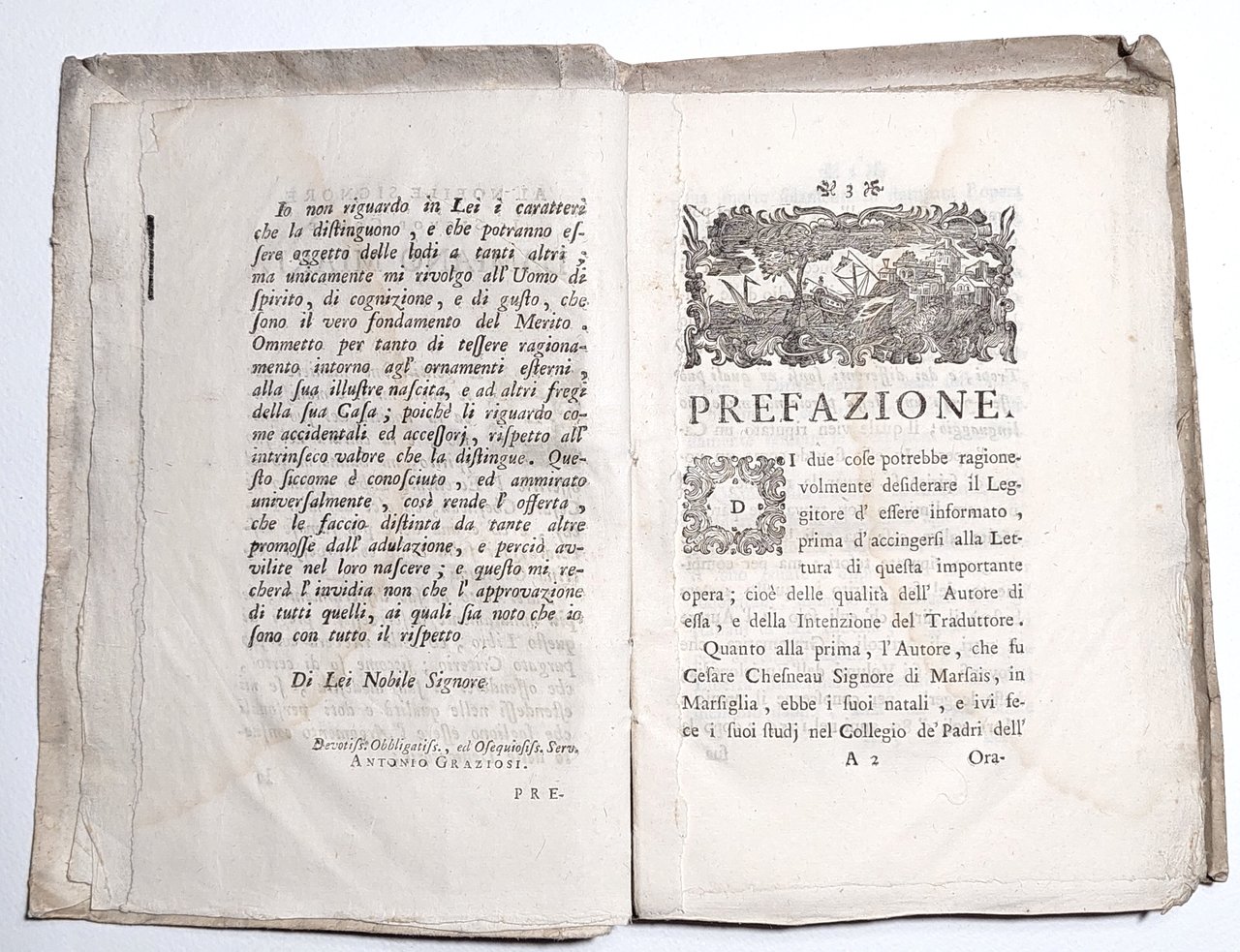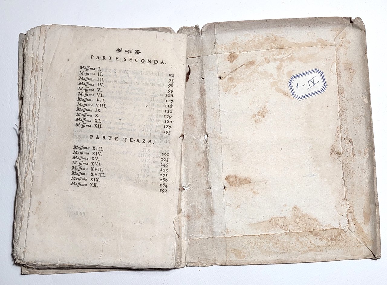 Legatura in cartonato rustico in condizioni accettabili quasi staccata dal volume, vedere immagini, pieghe ai margini dei piatti, alcuni aloni e sporcizie ai piatti e al dorso, dorso con piccole rotture in corrispondenza della legatura, pieghe ai margini, un lieve alone di umidità al margine esterno delle pagine che va via via attenuandosi, frontespizio con numero di catalogazione a matita al margine inferiore e fregio xilografico, tagli irregolari, leggermente bruniti, legatura leggermente allentata, numero pagine 296, etichetta di catalogazione alla terza di copertina, dimensioni cm 21 x 14,5