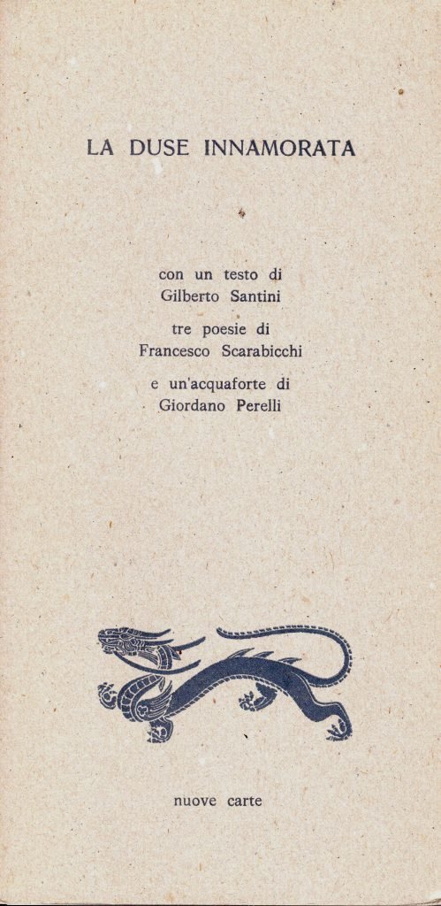 La Duse innamorata, prima edizione dicembre 1996, formato 12 x 25.<BR>Copertina morbida di colore grigio con titoli in nero al piatto anteriore. Volume non rilegato. <BR>Testo di Gilberto santini. Tre poesie di Francesco Scarabicchi e un'acquaforte di Giordano Perelli. Edizione stampata in 75 esemplari numerati. Nostro n. 55.<BR>Ottime condizioni.