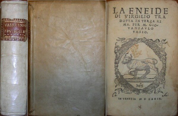 in-8 antico, ccnn 272, leg. perg. molle rimontata con tass. in pelle rossa e tit. oro. Marca tipogr. in legno al front. Dedicat. di Domenico Buonamici a Monsignor Cesare Bacon. Il vero traduttore dell'opera è Tommaso Cambiatore originario di Reggio: il Vasio, letterato originario di Spilimbergo e cancelliere a San Daniele del Friuli, la corresse e ne ripubblicò la traduzione con l'aggiunta della biografia di Virgilio. Rara ediz. orig. nella versione del Vasio. Mambelli, Annali, p.183-184. Paitoni IV, 164. Argelati IV, 120 riferisce di una "falsificata edizione" [non è la nostra] che reca al front. la data del 1538 ed è mancante di "24 terzetti" nel secondo capitolo del Libro primo. L'ultima carta bianca è malposta e precede la Vita di Virgilio. Kallendorf n.14. Lieve alone al front. e legg. gora all'angolo inf. delle ultime 30 cc. circa, minuscolo forellino di tarlo. Bell'esempl. a larghi margini. [064]