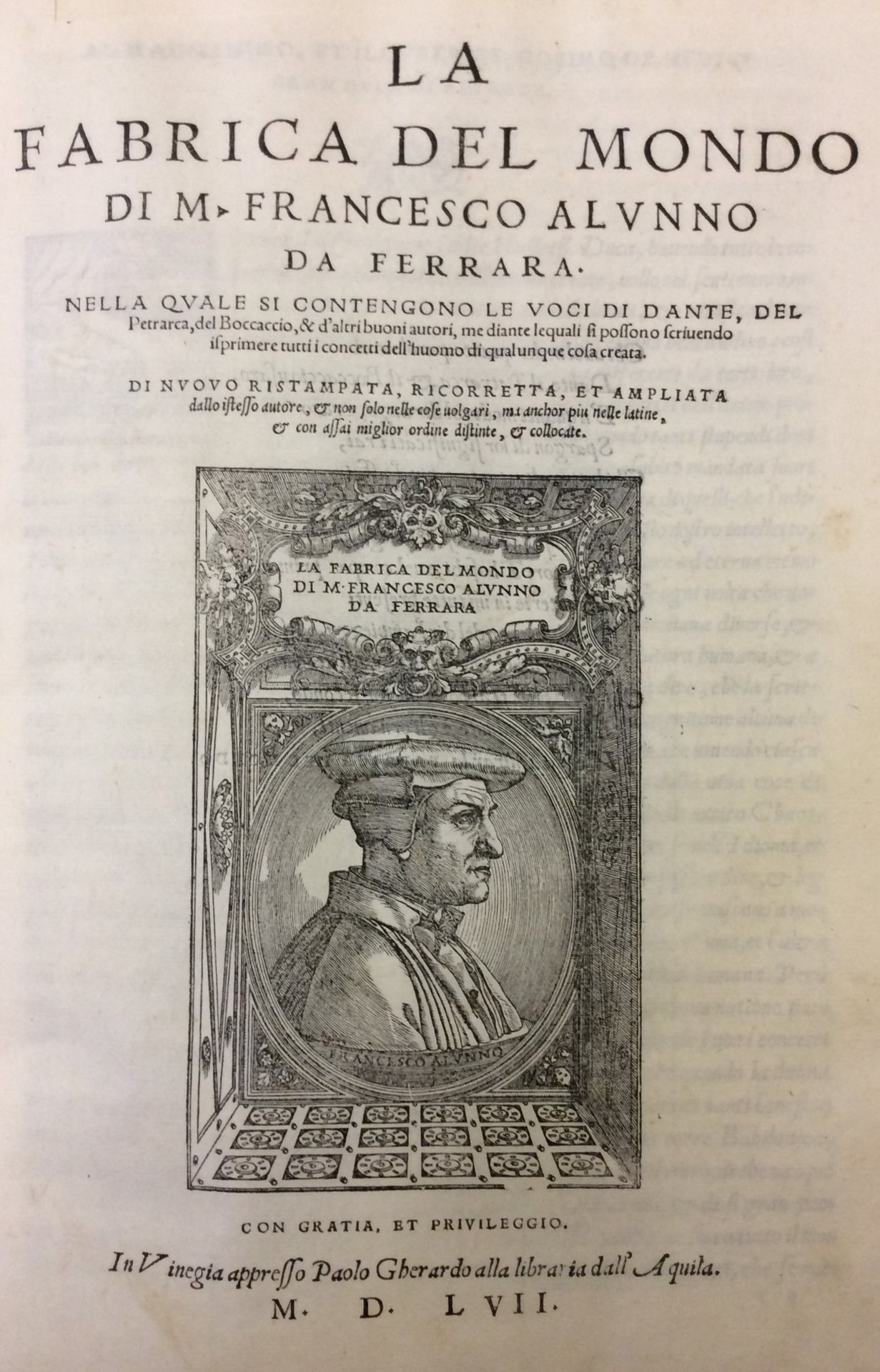 In-4 p. (mm. 307x205), mezza pergamena con angoli moderna, titolo oro su tassello al dorso, 32 cc.nn., 237 cc.num., frontespizio con ritratto silografato di Alunno (racchiuso in elaborata cornice). Testo ornato da grandi capilett. figur. a vignetta, pure inc. su legno.L'opera, dedicata a Cosimo de Medici, contiene ".. le voci di Dante, del Petrarca, del Boccaccio, & d'altri buoni autori, mediante le quali si possono scrivendo isprimere tutti i concetti dell'huomo di qualunque cosa creata. Di nuovo ristampata, ricorretta, et ampliata dallo istesso autore, & non solo nelle cose volgari, ma anchor più nelle latine, & con assai miglior ordine distinte, & collocate. Francesco Alunno, nome umanistico del grammatico e calligrafo Francesco del Bailo (Ferrara 1485 circa - Venezia 1556).. notevole la "Fabrica del mondo" (1546-48), vocabolario metodico, in 10 libri, della lingua volgare (cfr. Treccani online). "Imperfetto abbozzo degli odierni Vocabolarii che sin dallanno 1546 cominciò a pubblicarsi in Venezia" (così Gamba,2755). Cfr. Adams,I,838 - Graesse,I,88. Mancanza al margine superiore del frontespizio; solo alc. cc. uniformemente arrossate, ma certamente esemplare ben conservato.