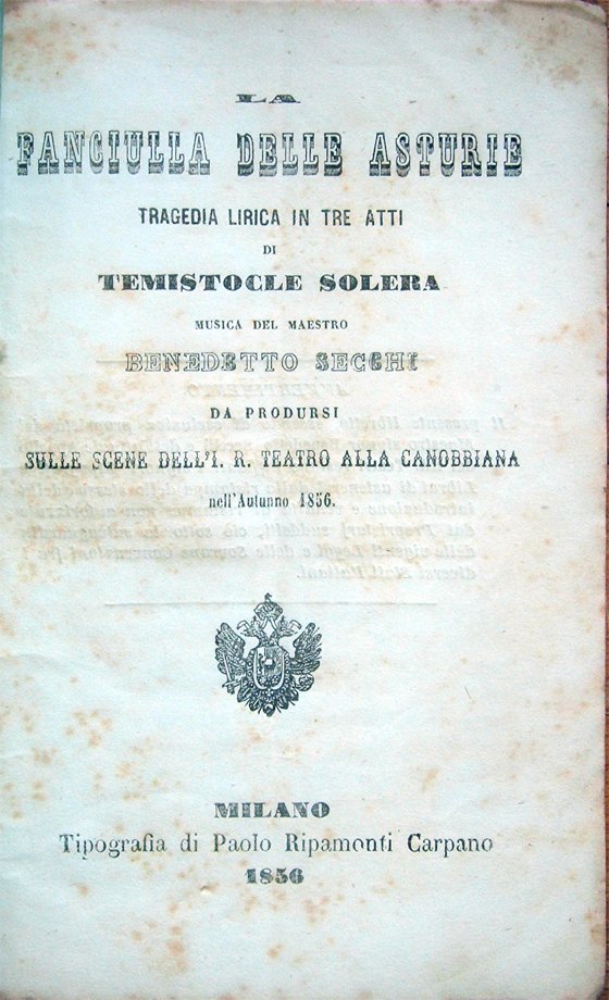 La fanciulla delle Asturie. Tragedia lirica in tre atti di Temistocle Solera. Musica del Maestro Benedetto Secchi. Da prodursi sulle scene dell'I. R. Teatro alla Canobbiana nell'Autunno del 1856