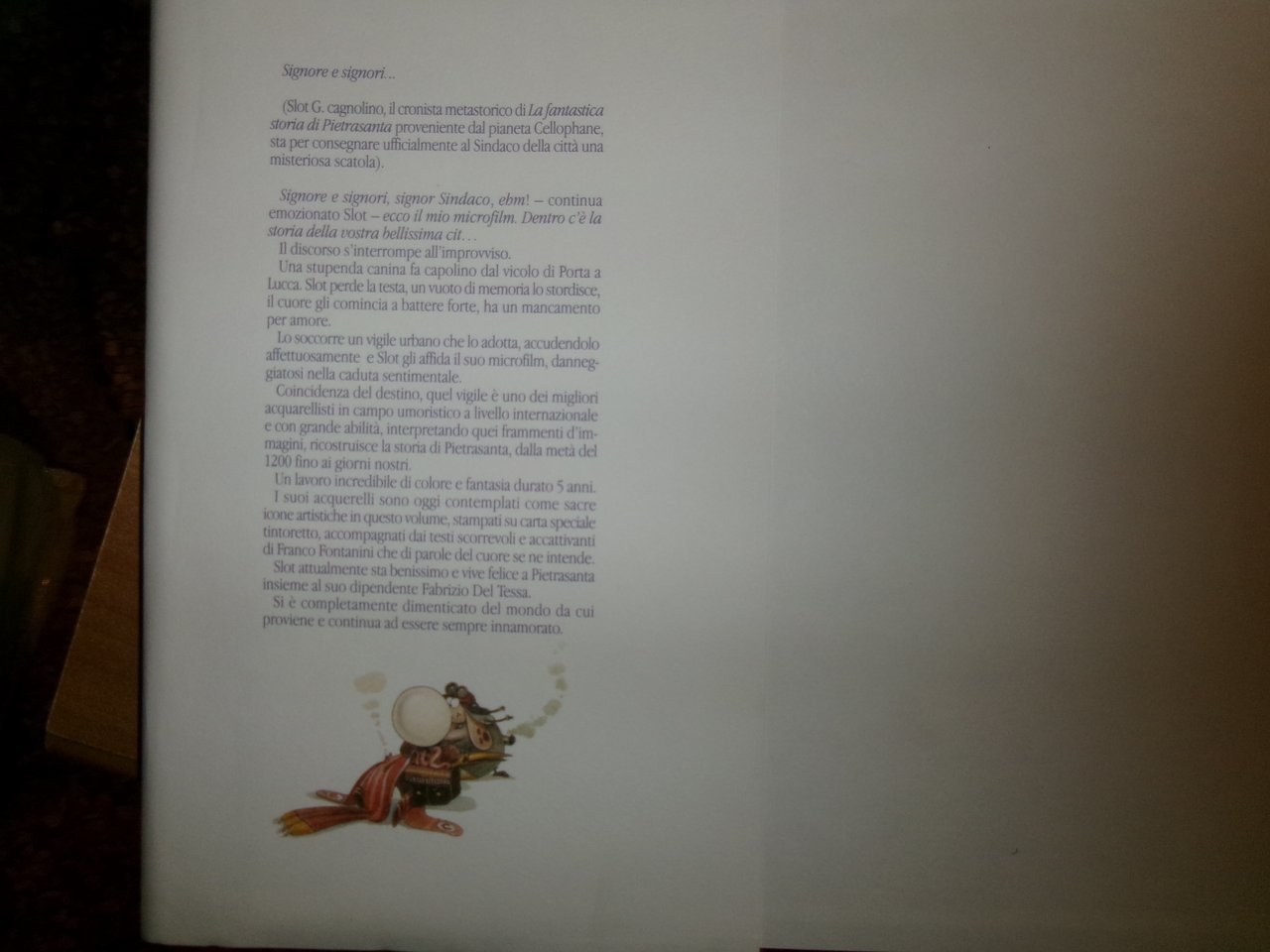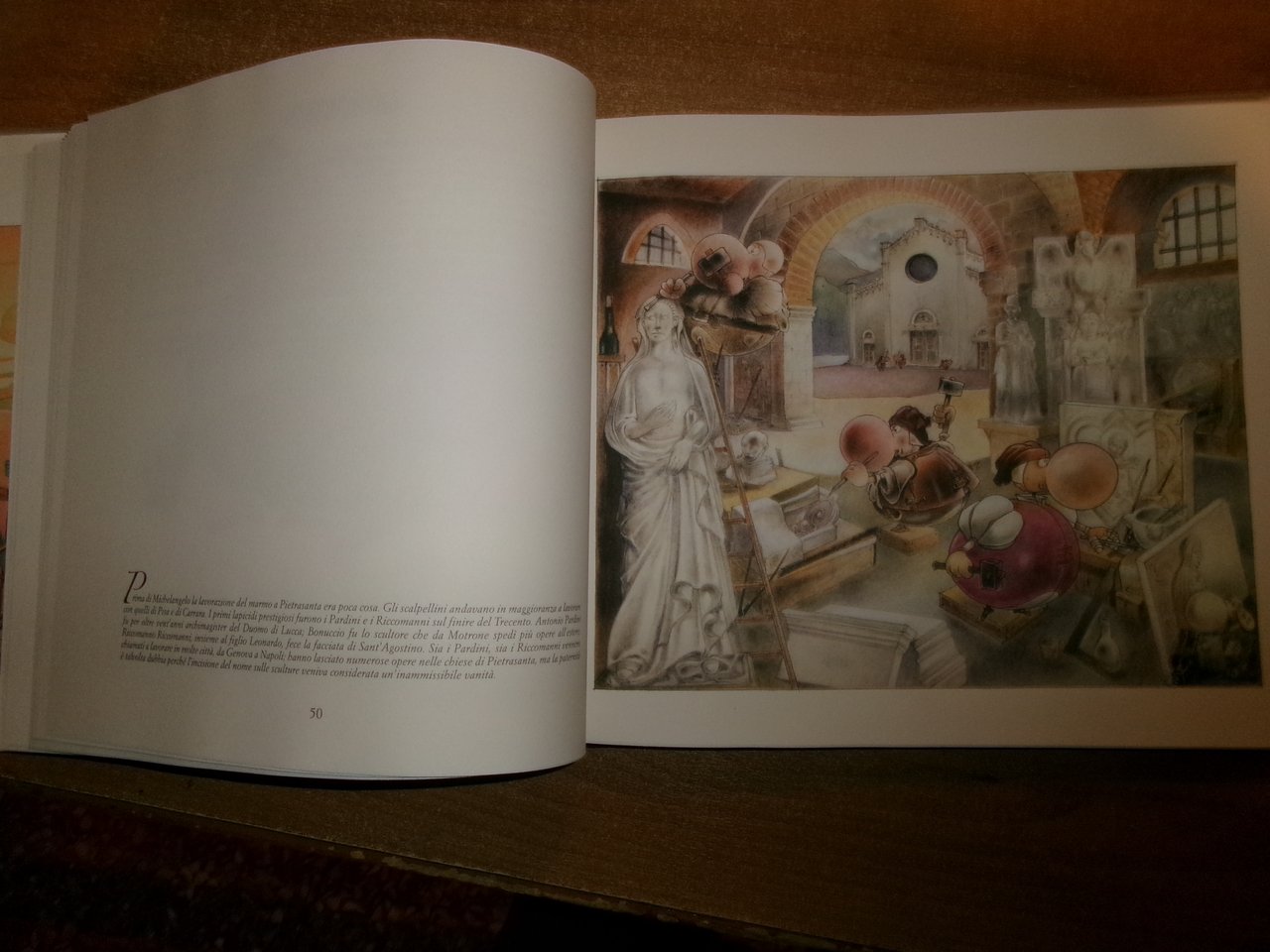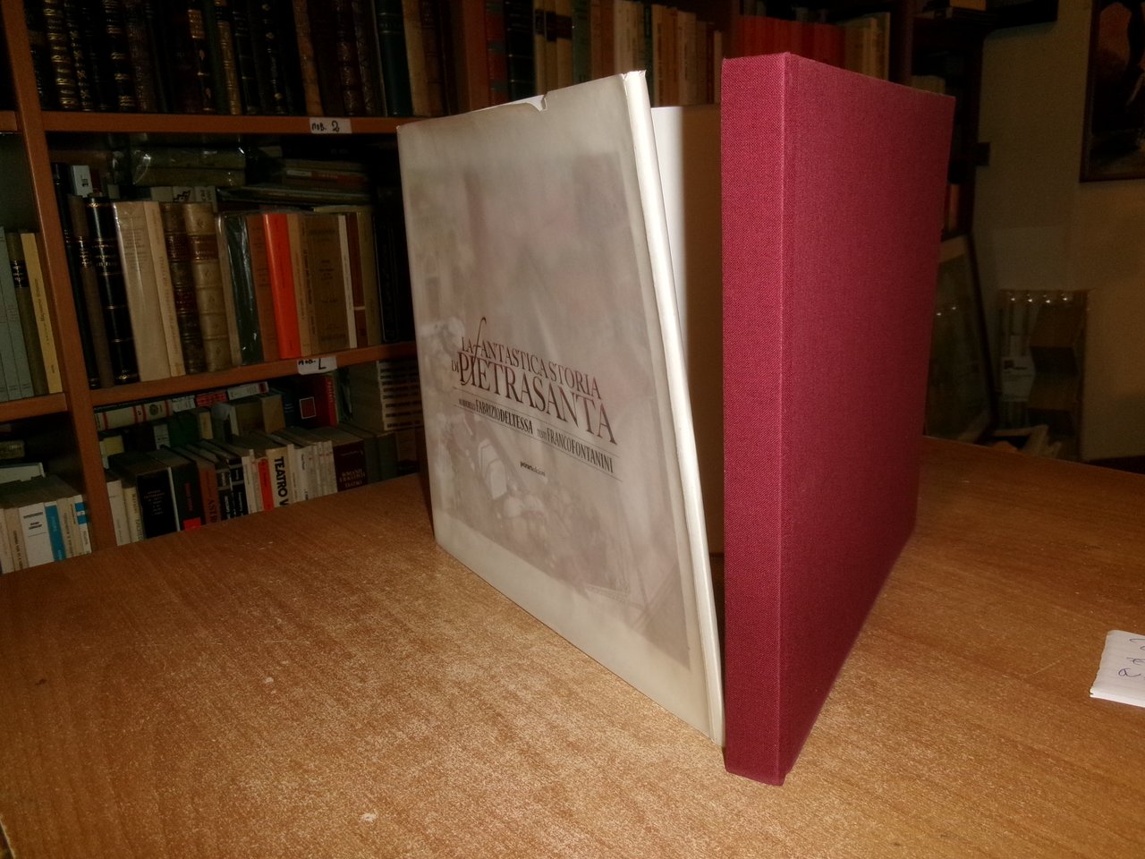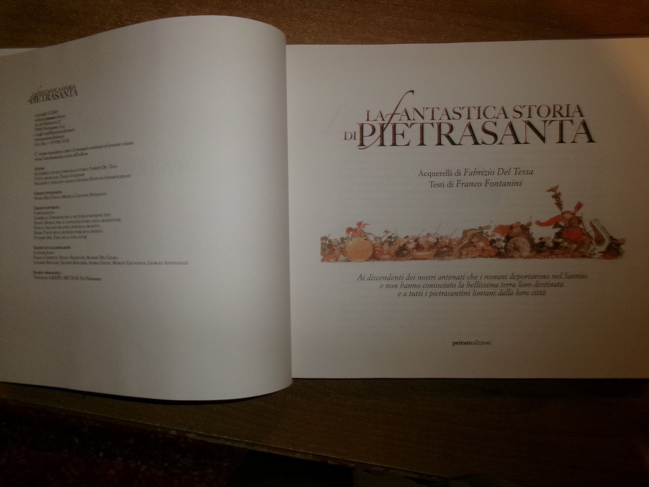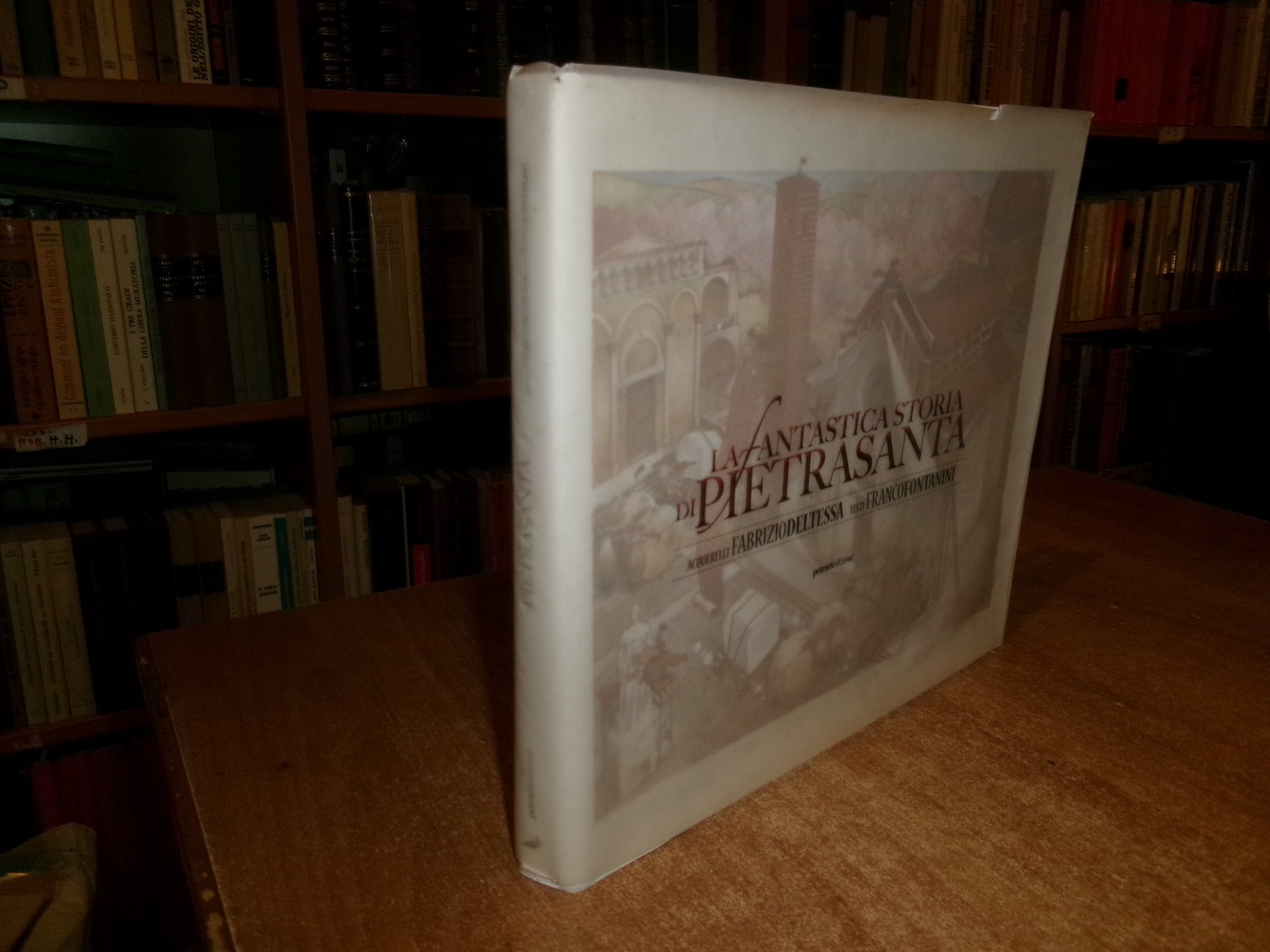 Acquerelli di Fabrizio Deltessa. Testi di Franco Fontanini. Pietrasanta, Petrarte Edizioni, 2005. La Fantastica Storia di PIETRASANTA. Ai discendenti dei nostri antenati che i romani deportarono nel Sannio e non hanno conosciuto la bellissima terra loro destinata e a tutti i pietrasantini lontani dalla loro città. In-8° grande oblungo, tela edit. bordeaux con doppia sovracopertina. 188 pp. con numerose illustrazioni a colori molte delle quali a piena pagina. Sovracopertina trasparente con lievi segni d' uso ma libro come nuovo. Capolavoro esaurito. Neg. mob. rosso.
