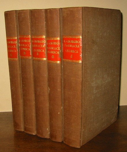8vo (cm. 22,2), 5 Voll., 4 cc.nn., XXI(1)-335(3) pp.; 4 cc.nn., XVI-376; XIX(1)-409(1) pp., 2 cc.nn.; 371(3) pp.; 426, 111(1) pp. Antiporta (raffigurante l’interno di una spezieria ed incisa su rame da A. Barioli) ed una tav. f.t. ripiegata in fine del primo vol. (di due). Legatura inizi ‘900 in piena tela con titolo oro su tassello in pelle al ds. Tagli colorati. Ottimo esemplare. Raro. Duveen, 529.