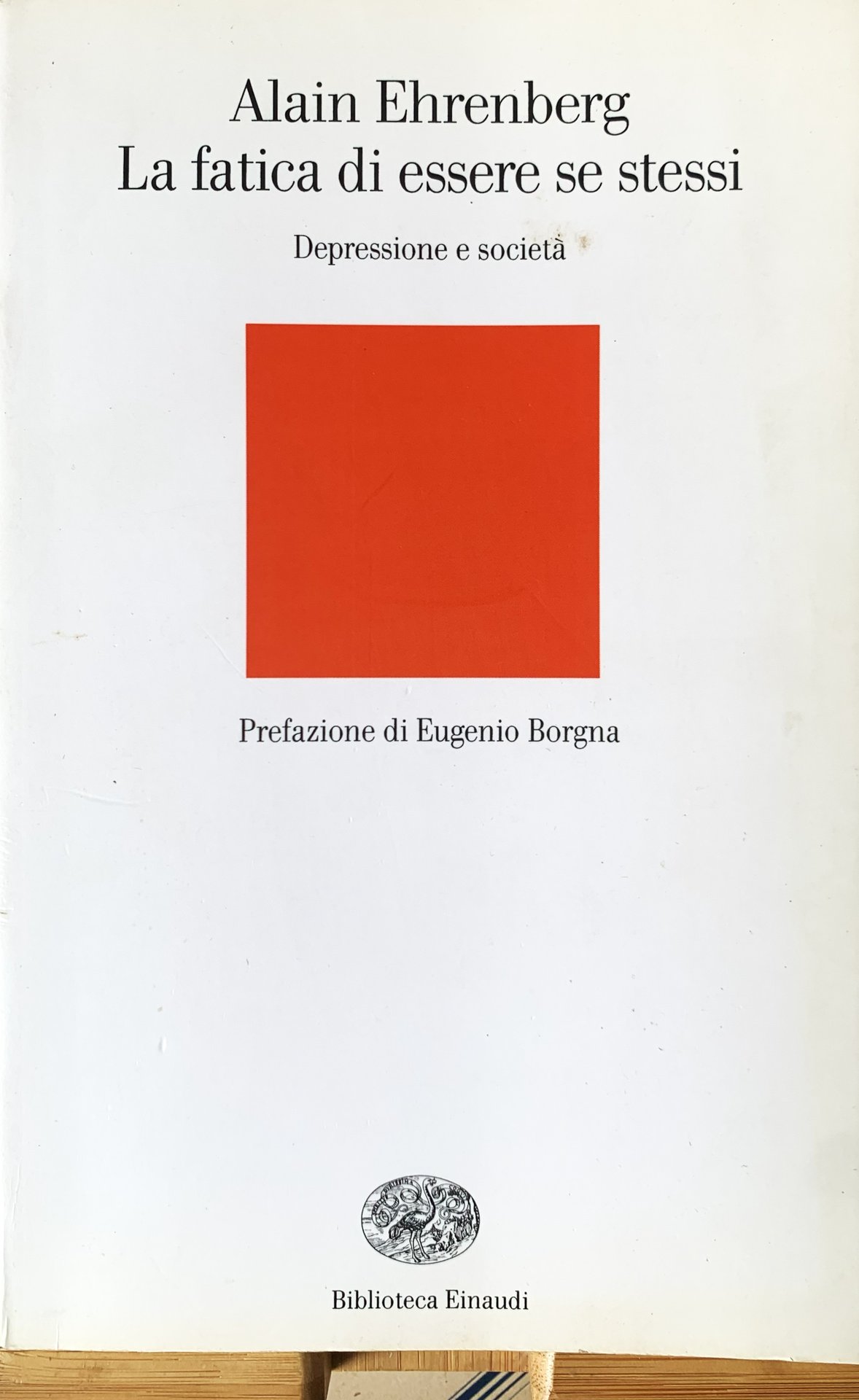 V ristampa italiana: (I ed.: La fatigue d'être soi. Dépression et societé, Paris, Éditions Odile Jacob). Traduzione: Sergio Arecco. revisione critica: Davide Tarizzo. Collana Biblioteca Einaudi 75. VIII/ XXIV+3287 brossura satinata con grafica in b/n/arancione. Stato buono-ottimo. Indice: Prefazione; Eugenio Borgna - Introduzione. L'individuo sovrano o il ritorno della nervosità - Un soggetto malato (Quale storia della depressione? - Genesi della creatura psichica - Elettroshock: tecnica, umore e depressione - La socializzazione di una patologia indefinibile) - Il crepuscolo della nevrosi (La crisi della depressione nevrotica, il cambiamento di figurazione del soggetto - Il fronte psicologico: la colpa senza ingiunzionui - Il fronte medico: il nuovo corso dell'umore ddepressivo) - L'individuo insufficiente (L'azione patologica: secondo cambiamento di figurazione del soggetto La "panne" depressiva - Il soggetto incerto della depressione l'individuo di fine secolo) - Conclusione. Il peeso del possibile.