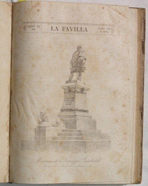 In 8. Dim. 24,5x17,5 cm. Pp. 384. Rara annata completa del 1887 composta da dodici riviste de La Favilla, rivista di letteratura dell'Umbria. La rivista venne pubblicata dal 1869 al 1910. Qualche pagina dedicata all'attualità di Perugia (i soldati morti a Dogali), la lista di alcune pubblicazioni locali, articoli di archeologia umbra, leggende locali, momenti storici. Numerose anche le poesie in dialetto e racconti di usi e costumi umbri. Tra gli articoli presenti: il terremoto di Rieti del 1703, la morte di Antonio Cristofani, le maioliche di Deruta, i canti popolari spoletini ecc. Qualche incisione all'interno. Legatura in mezza pelle coeva. In buone condizioni. Copertina in mezza pelle coeva con titolo e decorazioni in oro al dorso in buone condizioni generali con lievi usure ai margini e dorso. Legatura in buone condizioni. All'interno le pagine si presentano in buone condizioni con fioriture. Scarce complete collection of the year 1887 made up of twelve magazines of the La Favilla, magazine of litterature of Umbria. The magazine was published between 1869 and 1910. Some pages are dedicated to the news of Perugia (the dead soldier in Dogali), the list of some local books, articles of umbrian archeology, local legends, historical moments. Difefrent poems in umbrian dialects and articles of usage and traditions. Among the articles in the collection: the earthquake in Rieti of 1703, the death of Antonio Cristofani, the ceramics of Deruta, the popular songs of Spoleto etc. Some engraving inside. Half leather coeval binding. In good conditions. Half leather coeval cover with golden decorations and title in the spine in good general conditions slightly worn in the edges and spine. Binding in good conditions. Inside pages are in good conditions with foxings.