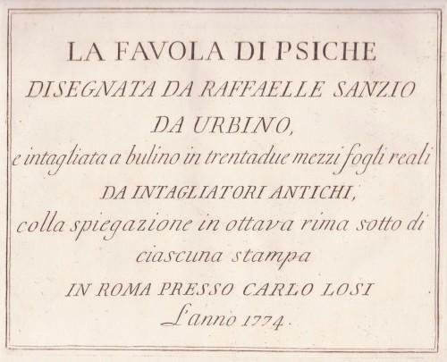 La favola di Psiche disegnata da Raffaello Sanzio da Urbino e intagliata a bulino in trentadue mezzi fogli reali da intagliatori antichi, colla spiegazione in ottava rima sotto di ciascuna stampa