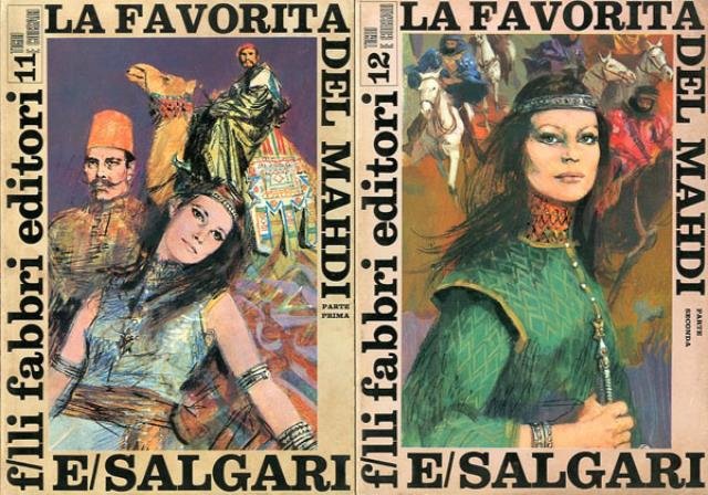 2 v. (310 p.) : ill. ; 24 x 16 cm. Tigri e corsari, 11, 12. Storia d'amore tra Abd-el-Kerim, già promesso a Elenka, e Fathma, ambientata nel Sudan durante la guerra mahdista. Fathma, la protagonista e favorita del Mahdi, per rifiutarsi a tale unione organizzata, scappa via di casa, travestita da danzatrice. Nel deserto africano, la ragazza viene aggredita da un leone, però un giovane avventuriero (Kerim) la salva, e così tra i due sboccia l'amore. Notis, il fratello di Elenka, si innamora anch'egli di Fathma, e cattura il giovane con l'aiuto del califfo Fit Debbeud. Kerim riesce però a fuggire ed ad uccidere Notis in un duello. Il greco non è però realmente morto e, per vendicarsi, decide di denunciare Kerim come spia al comandante Hicks pascia che obbliga l'arabo a seguirlo verso il fronte seguito da Elenka, la quale è ancora innamorata di lui. Notis fa rapire Fathma da Fit Debbeud, ma Omar ( lo schiavo nubiano di Kerim) la libera ed i due fuggono su di una barca lungo il Nilo, riuscendo anche ad uccidere Notis e Debbeud. I mahdisti assaltano la loro barca, obbligandoli a procedere a piedi. Omar e Fathma salvano da un leone lo sceicco Abù-el-Nèmr ed uccidono Elenka dopo un duello con Fathma. Giunti al campo di Hicks pascia, vengono a sapere che Kerim è caduto prigioniero dei mahdisti. Le truppe di Hicks vengono distrutte nella battaglia di Kashghil ed Omar e Fathma vengono catturati, ma evitano i terribili supplizi riservati ai prigionieri grazie all'aiuto di Abù-el-Nèmr. Abd-el-Kerim incontra il Mahdi, il quale deicide di risparmiarli la vita poiché il suo esercito ha bisogno di ufficiali. Un misterioso beduino rileva però al Mahdi che Kerim è l'amante di Fathma. Fuori di sé, il Mahdi fa arrestare e torturare Kerim, ma poi il beduino gli chiede di restituirli Kerim vivo. Il beduino e El-Mactud origliano un incontro tra Abu e Omar e capiscono che Fathma è viva. I due vengono però scoperti: il beduino viene catturato ma Mactud riesce a fuggire. Il beduino era in realtà Notis, il quale confessa ad Omar dove tiene prigioniero Kerim. Intanto Mactud, non sapendo che Notis ama Fathma, la cattura e la consegna al Mahdi in cambio della liberazione di Notis. Quando Mactud libera Notis, quest'ultimo, venuto a sapere dell'imminente condanna a morte di Fathma, uccide Mactud e fugge a cavallo verso il lago dove Fathma verrà annegata, con alle calcagna Abu e Omar. Giunti a lago, salva Fathma, ma viene finalmente ucciso da Omar. Poco dopo, Abd-el-Kerim e Fathma si riabbracciano. Mesi dopo, Abù-el-Nèmr ed il Mahdi passeggiano insieme ed il primo appare notevolmente scosso. Un messaggero porta loro una lettera da parte di Kerim e Fathma i quali ringraziano il Mahdi per averli concesso la libertà. Il libro si conclude con il suicidio di Abù-el-Nèmr, il quale si era innamorato di Fathma. Brossura editoriale, coperta in cartoncino flessibile plastificato, illustrata a colori, con il titolo impresso al piatto e al dorso. Qualche segno del tempo alla coperta, al dorso e al taglio (ingiallimento), per il resto libro accettabile. Codice libreria 5519.