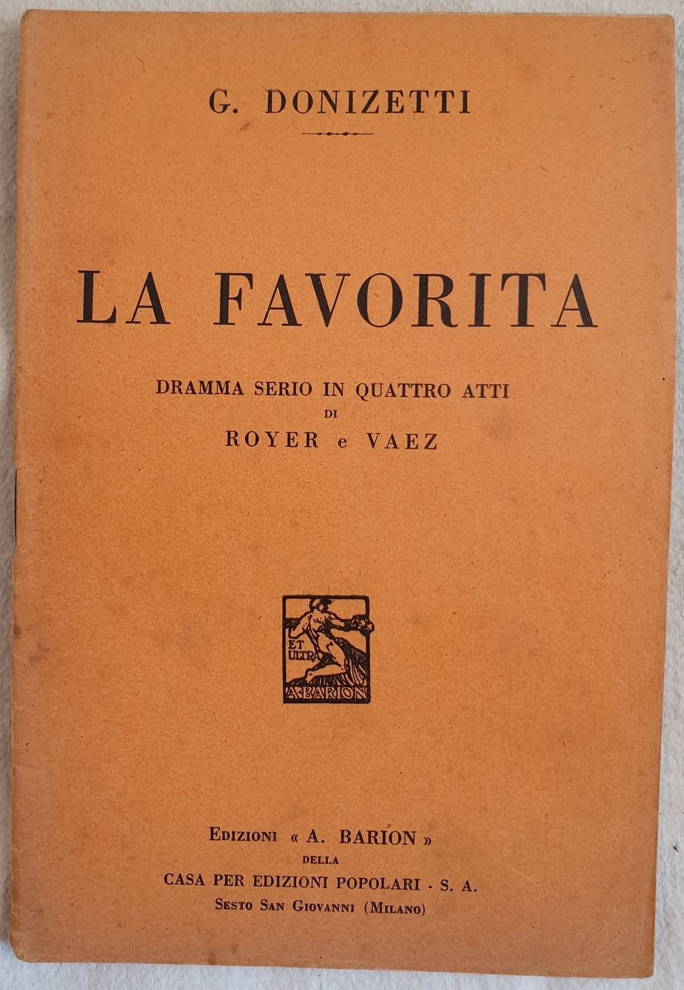 Bel libretto d'opera del 1934 dell'opera "La favorita" di Gaetano Donizetti (1797-1848) su libretto di Royer e Vaez.<BR>La prima rappresentazione ebbe luogo al Teatro Opera di Parigi il 2 dicembre 1840.<BR>In ottime condizioni. Brossura editoriale in discrete condizioni generali con usure ai margini e dorso. Piattto anteriore in parte staccato. Legatura in buone condizioni. All'interno le pagine si presentano in buone condizioni con rare fioriture. In 16. Dim. 18x12 cm. Pp. 32.