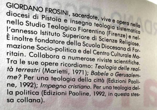 GIORDANO FROSINI, docente di teologia sistematica nella Facoltà Teologica dell'Italia Centrale, è autore di numerose opere maturate nell'insegnamento e nell'attività pastorale. Suo intento è sempre stato quello di unire insieme la serietà scientifica e lo stile semplice e piano, possibilmente alla portata di tutti. Di un primo ideale periodo dedicato alla riflessione sulle realtà penultime, si possono ricordare: Teologia delle realtà terrestri (1971), La fede e le opere. Le teologie della prassi (1992), L'impegno cristiano. Per una teologia della politica (21993), Babele o Gerusalemme? Per una teologia della città (1992), L'attività umana. Per una teologia del lavoro (1994), In politica da cristiani (1994), Per una spiritualità della politica (1996), Il pensiero sociale dei Padri (1996). Del periodo più direttamente teologico Aspettando l'aurora. Saggio di escatologia cristiana (31996), Una Chiesa possibile (1995), Teologia oggi. Una sintesi completa e aggiornata (21997), il trittico «Chi dite che io sia?». Una cristologia per tutti (1997), Lo Spirito che dà la vita. Sintesi di pneumatologia (21998), Incontro al Padre. Una Teo-logia per tutti (21999). Opere che hanno suscitato l'interesse della critica e degli operatori pastorali. Alcune sono state tradotte in albanese. Collabora a riviste scientifiche, periodici e giornali.