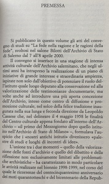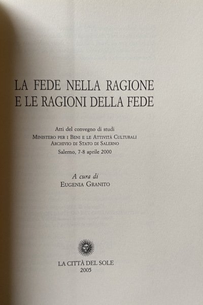 Titolo: La fede nella ragione e le ragioni della fede. Atti del Convegno di studi tenutosi nel salone Bilotti dell'Archivio di Stato di Salerno, 7-8 aprile 2000.