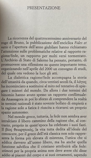 Si pubblicano in questo volume gli atti del convegno di studi su "La fede nella ragione e le ragioni della fede", svoltosi nel salone Bilotti dell'Archivio di Stato di Salerno dal 7 all'8 aprile 2000. Il convegno si inserisce in una stagione di intensa attività culturale dell'Archivio salernitano, che negli ultimi anni ha intrapreso la realizzazione di un piano di iniziative di grande interesse e straordinaria ampiezza, ispirate non solo dall'obiettivo di potenziare il ruolo del l'istituto quale luogo deputato alla conservazione ed alla valorizzazione delle testimonianze documentarie, ma volte anche ad introdurre una più aperta concezione dell'Archivio, inteso come centro di diffusione e promozione culturale, nel solco della felice tradizione inaugurata nella sua lunga e feconda direzione da Leopoldo Cassese che, nel delineare il 4 maggio 1958 le finalità del Centro culturale appena fondato all'interno dell'Archivio «il primo del Mezzogiorno dopo quello istituito nell'Archivio di Stato di Milano» -, formulava l'auspicio che i «nostri antichi istituti» divenissero «palestre di studi e luoghi di incontri di idee». L'unione tra i due momenti - quello della valorizzazione delle fonti d'archivio e quello del dibattito e della riflessione non esclusivamente limitati alle problematiche archivistiche - ha caratterizzato in modo particolare le attività realizzate nel biennio 1998-1999, nel corso del quale le ricorrenze del centocinquantesimo anniversario dei moti quarantotteschi e del bicentenario.