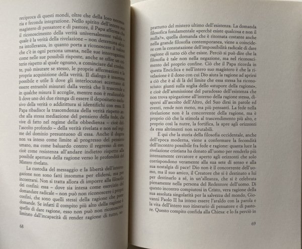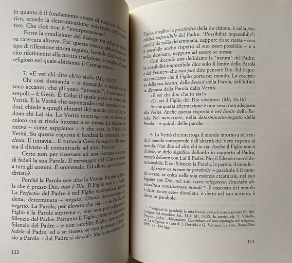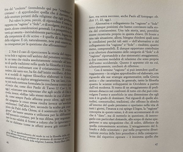 Soggetti: Fede, Religione, Teologia, Filosofia, Atti, Seminari, Convegni, Studi culturali, Storia, Rivelazione, Ebraismo, Cristianesimo, Ragione, Società, Scienze sociali, Ateismo, Giordano Bruno, Fides et Ratio, Dialettica, Salvezza, Platone, Aristotele, Dio, Esistenza, Etica Nicomachea, San Paolo, Lettera agli ebrei, Bibbia, Sacra Scrittura, Vangeli, Corinzi, Conflitti religiosi, Coscienza, Libertà, Laicismo, Stato, Riforma, Lutero, Chiesa, Clero, Persecuzioni, Santa Inquisizione, Galileo Galilei, Abiura, Scienza, Conoscenza, Sapere scientifico, Locke, Bayle, Shaftesbury, Hutcheson, Tolleranza religiosa, Radicalismo, Islam, Crociate, Terra Santa, Voltaire, Illuminismo, Positivismo, Adorno, Horkheimer, Philosophers, Lumières, Eclisse, Follia, Morale, Politica, Potere spirituale, Potere temporale, Secolarizzazione, Progresso, Modernità, Olocausto, Giudaismo, Antisemitismo, Husserl, Fenomenologia, Dewey, Scritture, Giustino, Clemente, Patristica, Gnosi, Giustificazione, Verità, Logos, Mistero, Credenti, Hanna Arendt, Totalitarismo, Sant'Agostino, Anselmo, Tommaso d'Aquino, Niccolò Cusano, Kenosi, Trinità, Spiritualità, Redenzione, Sacramenti, Encicliche, Papa, Bruno Forte, Dogma, Dottrina, Neoplatonismo, Antico Testamento, Assoluto, Troeltsch, Schleiermacher, Gerusalemme, Israele, Genesi, Ilya Prigogine, Saggistica, Libri Vintage Fuori catalogo, Faith, Religion, Theology, Philosophy, Proceedings, Seminars, Conferences, Cultural studies, History, Revelation, Judaism, Christianity, Reason, Society, Social sciences, Atheism, Dialectics, Salvation, Plato, Aristotle, God, Existence, Nicomachean Ethics, Saint Paul, Letter to the Hebrews, Bible, Holy Scripture, Gospels, Corinthians, Religious conflicts, Conscience, Freedom, Secularism, State, Reform, Luther, Church, Clergy, Persecutions, Holy Inquisition, Abjuration, Science, Knowledge, Scientific knowledge, Religious tolerance, Radicalism, Crusades, Holy Land, Enlightenment, Positivism, Eclipse, Madness, Moral, Politics, Spiritual power, Temporal power, Secularization, Progress, Modernity, Holocaust, Judaism, Anti-Semitism, Phenomenology, Scriptures, Justin, Clement, Patristics, Gnosis, Justification, Truth, Mystery, Believers, Totalitarianism, St. Augustine, Anselm, Thomas Aquinas, Trinity, Spirituality, Redemption, Sacraments, Encyclicals, Pope, Doctrine, Neoplatonism, Old Testament, Absolute, Jerusalem, Israel, Genesis, Non-fiction, Out of print books