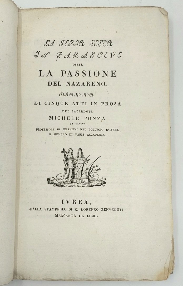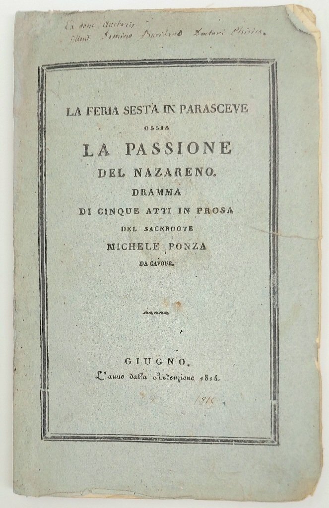 >in-8, pp. (8, le prime 2 bianche), 82, XXVI, (4, ult. 2 bianche), broch. edit. (manca la cop. poster.). Prima edizione di questo dramma sacro del piemontese M. Ponza, originario di Cavour, autore anche del noto ''Vocabolario piemontese-italiano ed italiano-piemontese''. Esempl. con dedica autogr. dell'autore sulla copertina.