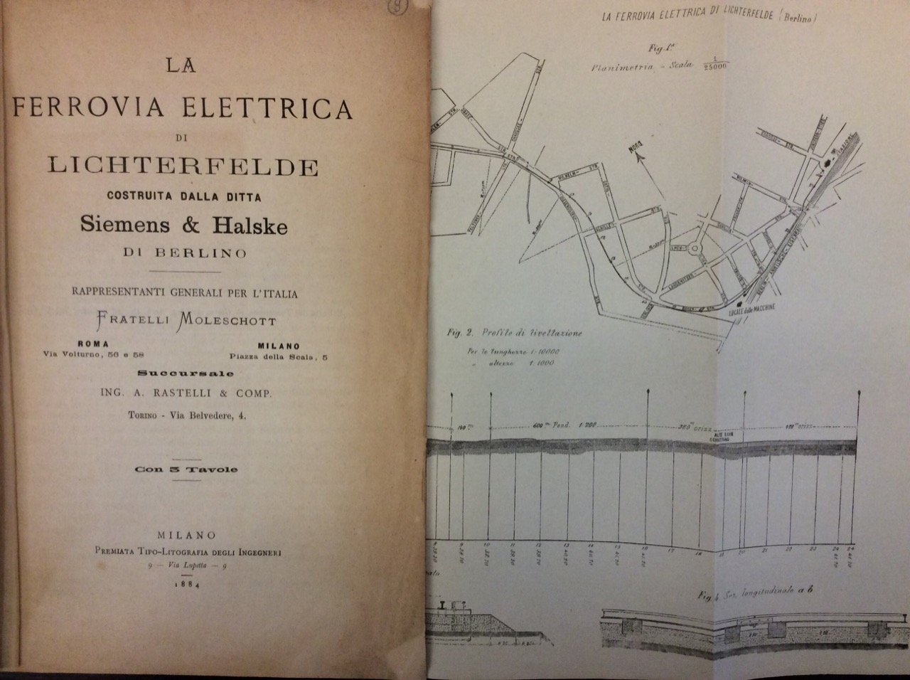 In-8 gr. (mm. 260x175), bross. orig. (restaurata per mancanze), pp. (2),8, con 16 interessanti figg., in 3 tavole litografiche più volte ripieg. fuori testo, relative a particolari della ferrovia elettrica. Estratto del Politecnico, Vol. XXXI. Buon esemplare.