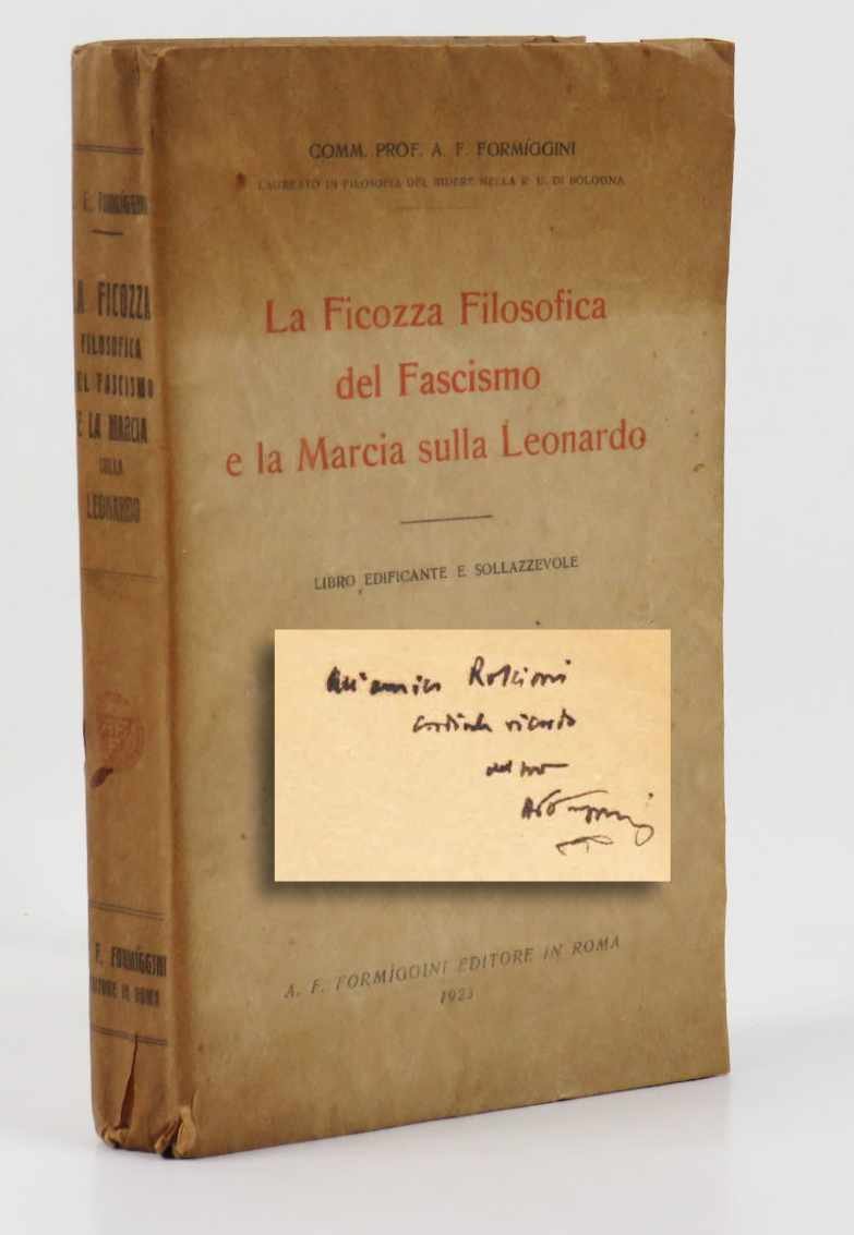 LIBROPrima edizione.CON AUTOGRAFO.Brunitura nella parte superiore della brossura, interno condizioni complessivamente ottime (primo fascicolo allentato). Dedica autografa dell’autore.Prima edizione dell’opera satirica di Formiggini «La ficozza del fascismo». Scrittore, umorista ma, soprattutto, editore Angelo Fortunato Formiggini iniziò la sua attività nel 1908 avendo come sola politica l’amore per i testi considerati degni di essere divulgati, con interessi che andavano dalla filosofia, alla letteratura, alla religione, alla passione per opere a carattere comico. La scarsa attenzione per gli aspetti finanziari e, soprattutto, l’angosciante clima generato dal regime di Mussolini - specie dopo la promulgazione delle leggi razziali nel 1938 - ebbero su Formiggini - sempre più convintamente antifascista e di origine ebraica benché distante da qualsivoglia afflato identitario e anzi sostenitore di un deciso assimilazionismo - un effetto devastante, spingendolo a gettarsi dalla torre del duomo di Modena, sua città d’origine, la mattina del 29 novembre 1938. In seguito a questo evento, la casa editrice - già nel 1931 trasformata in Società Anonima - andò incontro a un progressivo smantellamento fino alla chiusura nel 1941, quando la vedova Formiggini liquidò i soci e lasciò l’intero catalogo all’editore milanese Bietti.