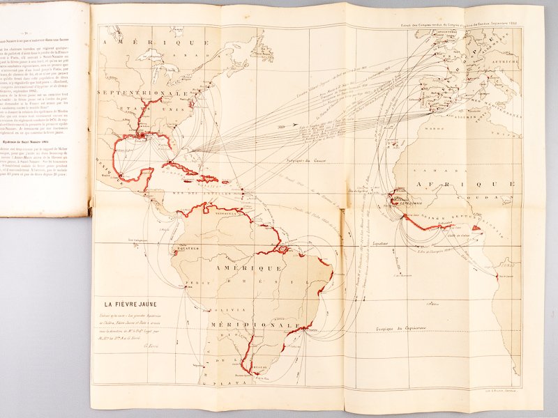 Avec un plan de l'Ile de Gorée et la carte du professeur Lanet indiquant la marche invasive de la fièvre jaune vers l'Europe, 1 vol. in-8 br., Imprimerie Nouvelle A. Bellier et Cie, Bordeaux, 1883, 100 pp. avec 2 plans (dont 1 grande carte dépliante) et 1 graphique Rare exemplaire dont nous détaillons ci-après la table des matières : Ile de Gorée - Les épidémies de fièvre jaune à Gorée (avec la relation de l'épidémie de l'Albatros 1882-1883) - Considérations générales sur les épidémies de Gorée - La fièvre jaune en Europe (Epidémies de Saint-Nazaire 1861 - du Lazaret de Mindin, 1881 - à Pauillac en 1881) - Règlement sanitaires. Etat moyen (couv. fort. frottée avec mq., des mouill.).