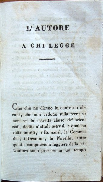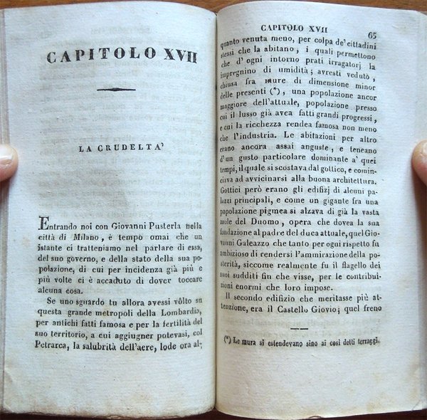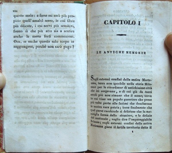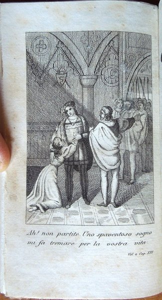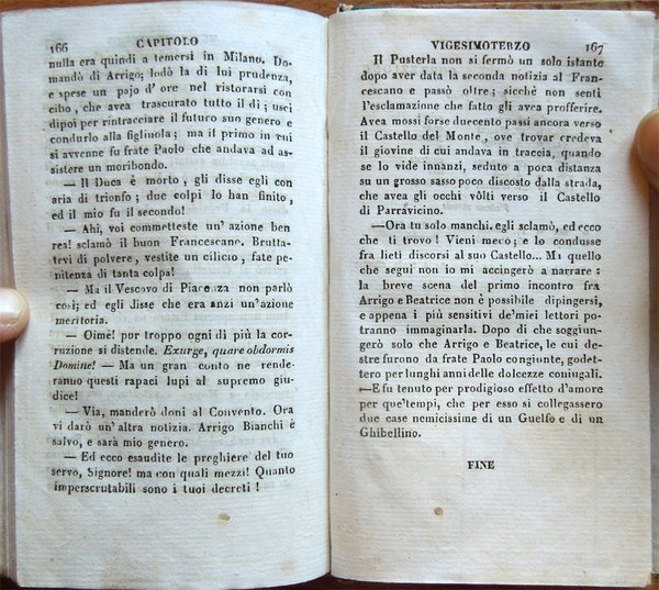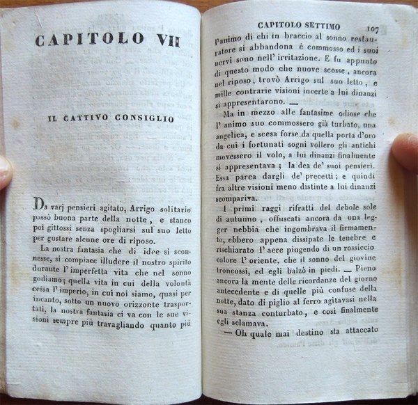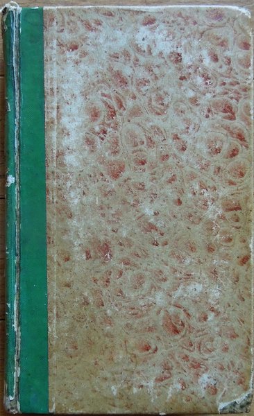 Due volumi in un tomo in-24° (12,8 x 7,6 cm), pp. VIII, 216; 167, (1), legatura coeva con piatti rivestiti di carta decorata e dorso di carta verde; titoli e fregi al dorso. Qualche segno d'uso e del tempo alla legatura, con alcune abrasioni e piccole mancanze al dorso, alle cerniere e agli angoli dei piatti. Al Volume II, tavola in antiporta fuori testo; al Volume I, la tavola in antiporta risulta mancante e viene allegata in riproduzione fotostatica, su foglio volante avente le stesse dimensioni delle pagine del libro. Al Volume I, piccolo restauro, ben eseguito con carta giapponese, nel margine esterno del foglio con le pagine 153-154 e di quello con le pagine 215-216 e nel margine inferiore del foglio ospitante le pagine 169-170. Al Volume II, due piccoli rinforzi in carta giapponese sul retro del frontespizio. Qualche leggero segno d'umido, per il resto, in buono stato. Opera non comune.