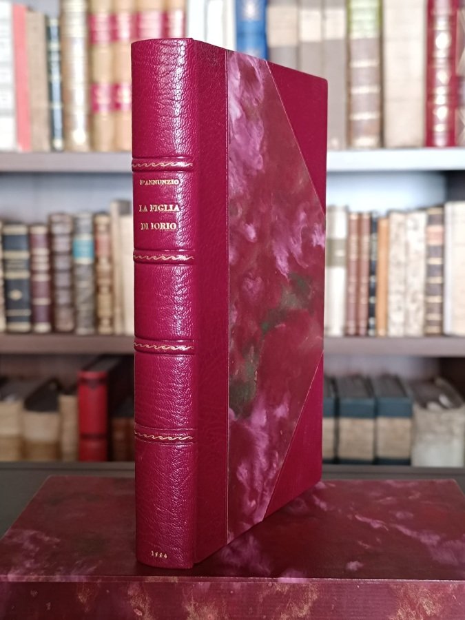 In-16° (cm. 17,5), bella legatura d'amatore in mezza pelle bordeaux ad angoli, dorso a nervi con titolo e fregi in oro alle nervature, piatti marmorizzati, taglio superiore dorato; conservata la brossura editoriale a stampa illustrata; pp. 166 [2] su carta greve, in ottimo stato. Edizione originale considerata artisticamente tra le migliori dannunziane, grazie alle ricche incisioni silografiche del De Karolis (tra capilettera, cornici e frontespizi). Cfr. Parenti 212; Guabello 166; De Medici 56; Pregliasco 110. Ottimo esemplare conservato in custodia con la stessa marmroizzatura dei piatti. (NX)