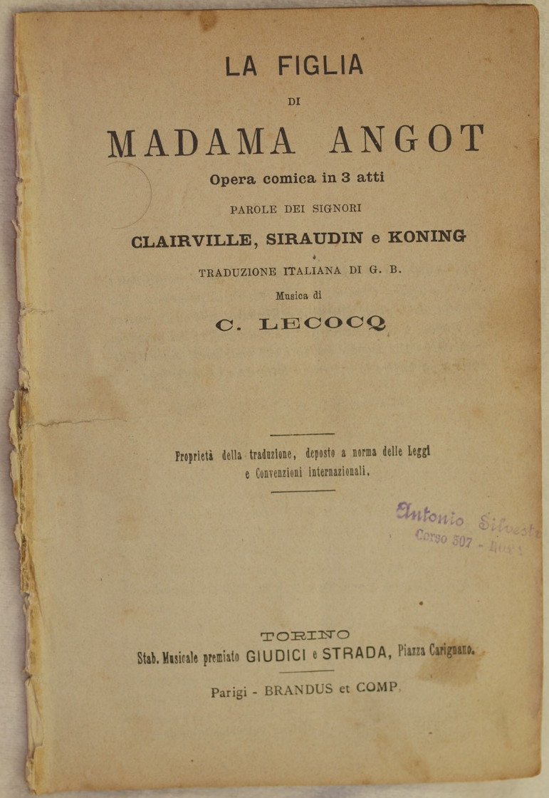 LA FIGLIA DI MADAMA ANGOT OPERA COMICA IN 3 ATTI PAROLE DEI SIGNORI CLAIRVILLE SIRAUDIN E KONING TRADUZIONE ITALIANA DI G. B. MUSICA DI C. LECOCQ