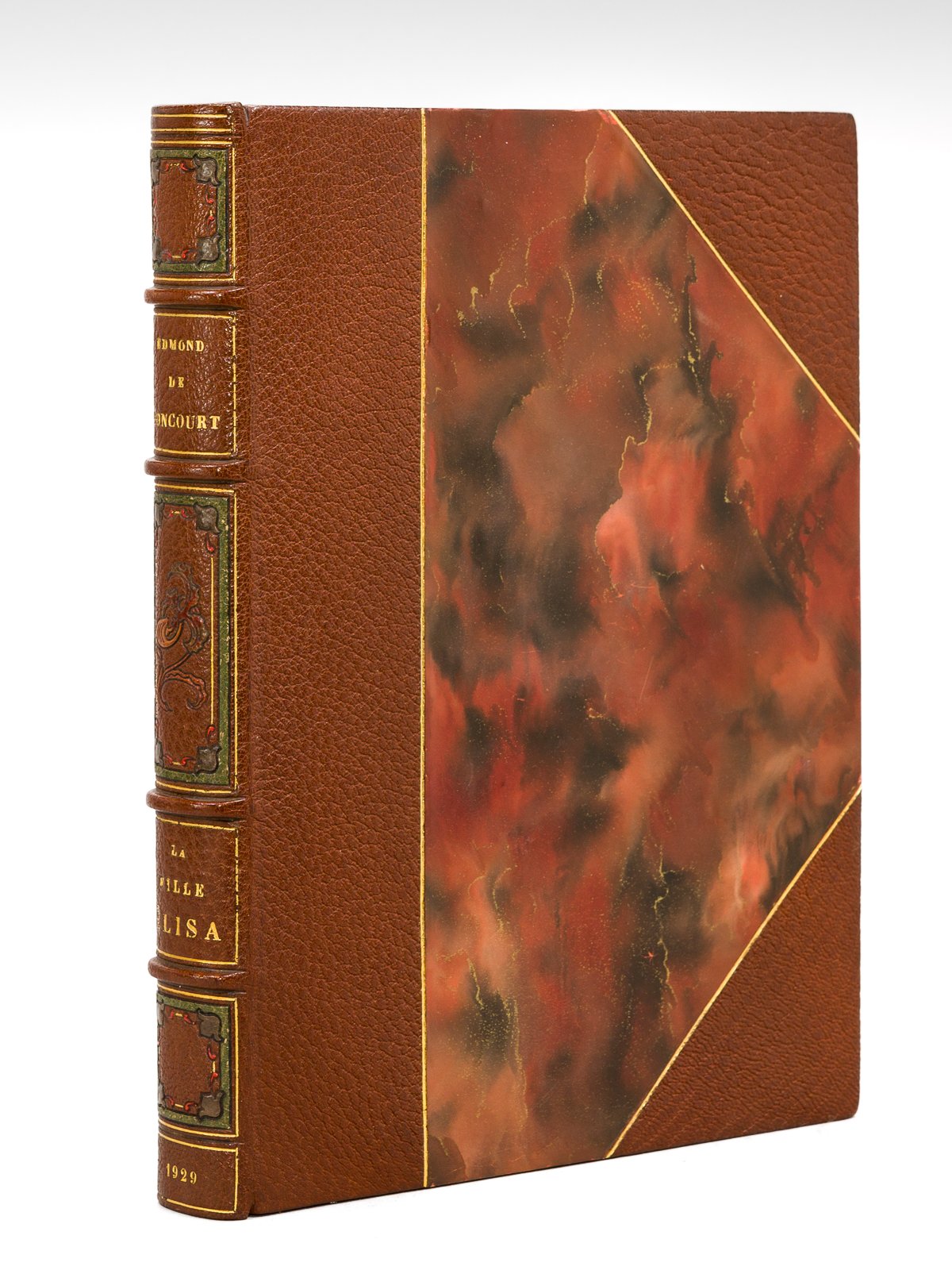 Edition illustrée de vingt pointes-sèches originales de Pau-Louis Guilbert, préface de J.-H. Rosny Ainé, postface de Jean Ajalbert, un des 350 exemplaires contenant l'état définitif de la gravure numéroté de 76 à 425 (n° 349), 1 vol. in-4 reliure de l'époque demi-maroquin à coins brun, dos à 4 nerfs , dos mosaïqué, filet doré en coins et mors, tête dorée, couverture conservée, reliure signée de René Aussourd, Le Livre du Bibliophile, Georges Briffaut, Paris, s.d. [ 1929 ], VI-201 pp. et 1 f. n. ch. avec 20 planches hors texte Belle reliure signée de René Aussourd, au dos mosaïqué dans le goût de l'art nouveau, si familier à son oncle Charles Meunier ; René Aussourd fut premier doreur chez Chambolle-Duru avant de s'établir à son compte. "Ses reliures sont en général assez classiques mais d'une grande perfection d'exécution" (Fléty, 14). Les pointes-sèches de Paul-Louis Guilbert illustrent remarquablement le sombre roman naturaliste d'Edmond de Goncourt relatant l'itinéraire de la prostituée Elisa, de son enfance misérable à sa mort en prison. Dans sa postface, Jean Ajalbert évoque la genèse du roman, en 1862, lors d'une visite des frères Goncourt à la maison centrale de Clermont-en-Beauvaisis : "ils y trouvaient les prisonnières soumises au supplice du silence continu, le système américain d'Auburn - la mort sans phrases" [. ]. Bon état (infimes pertes de dorure en dos, bel exemplaire par ailleurs)