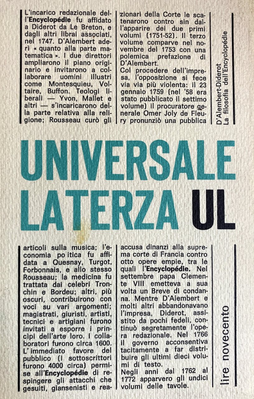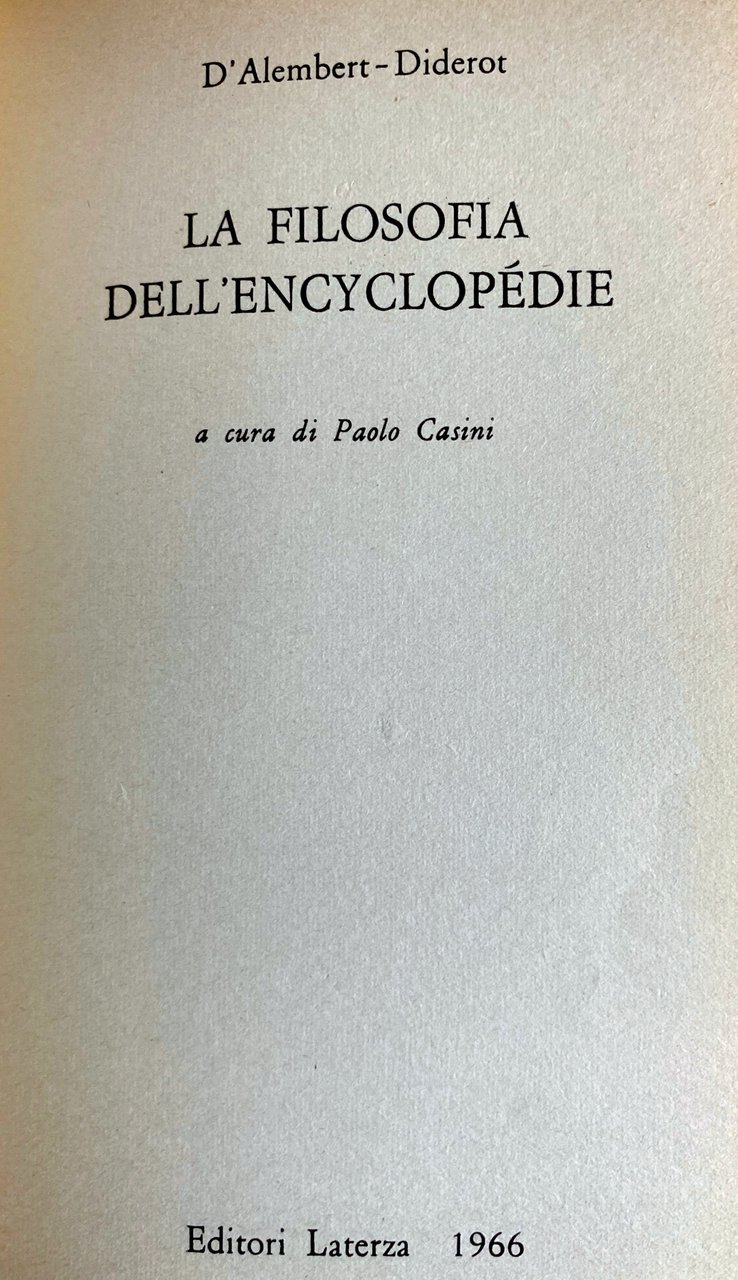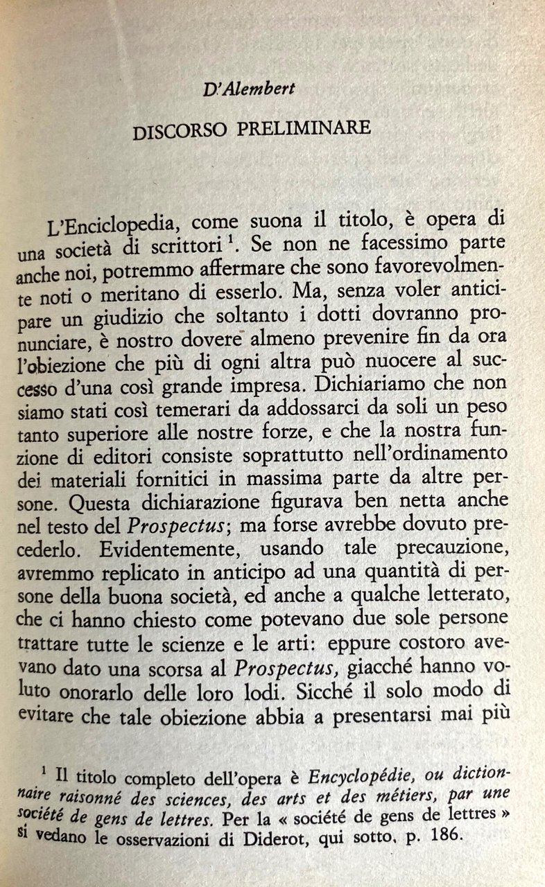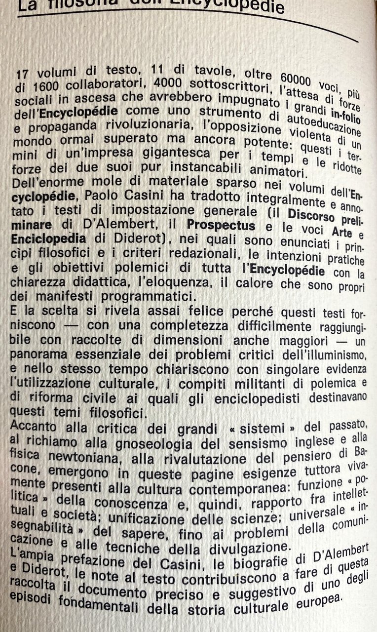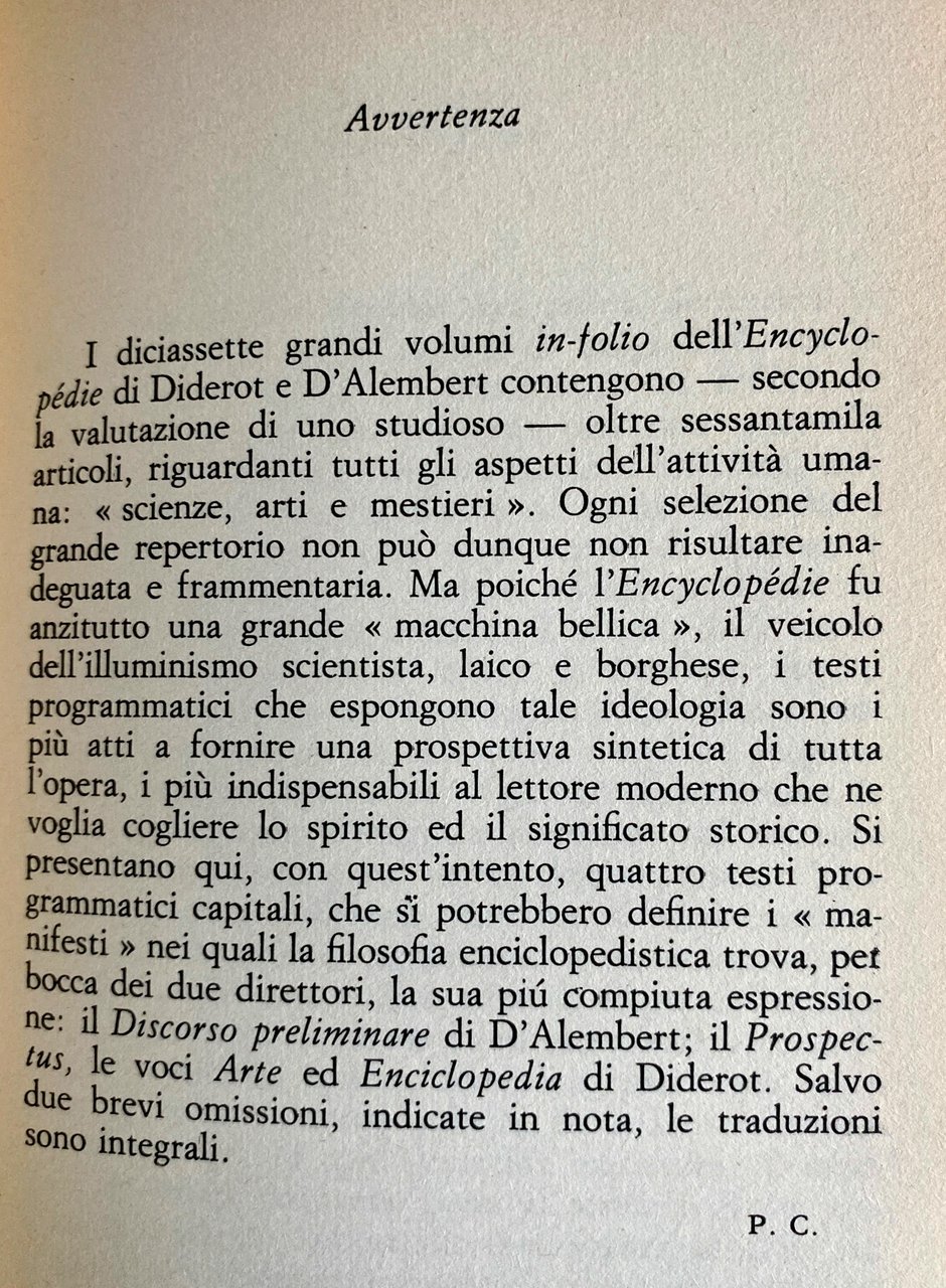 I diciassette grandi volumi in-folio dell'Encyclopédie di Diderot e D'Alembert contengono, secondo la valutazione di uno studioso, oltre sessantamila articoli, riguardanti tutti gli aspetti dell'attività umana: scienze, arti e mestieri. Ogni selezione del grande repertorio non può dunque non risultare inadeguata e frammentaria. Ma poiché l'Encyclopédie fu anzitutto una grande macchina bellica, il veicolo dell'illuminismo scientista, laico e borghese, i testi programmatici che espongono tale ideologia sono i più atti a fornire una prospettiva sintetica di tutta l'opera, i più indispensabili al lettore moderno che ne voglia cogliere lo spirito ed il significato storico. Si presentano qui, con quest'intento, quattro testi programmatici capitali, che si potrebbero definire i manifesti nei quali la filosofia enciclopedistica trova, per bocca dei due direttori, la sua più compiuta espressione: il Discorso preliminare di D'Alembert; il Prospectus, le voci Arte ed Enciclopedia di Diderot. Salvo due brevi omissioni, indicate in nota, le traduzioni sono integrali.