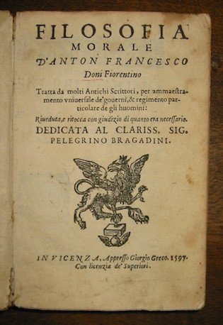 La filosofia morale d’Anton Francesco Doni fiorentino. Tratta da molti Antichi Scrittori, per ammaestramento universale de’ governi, & regimento particolare de gli huomini: riveduta, e ritocca con goiudizio di quanto era necessario