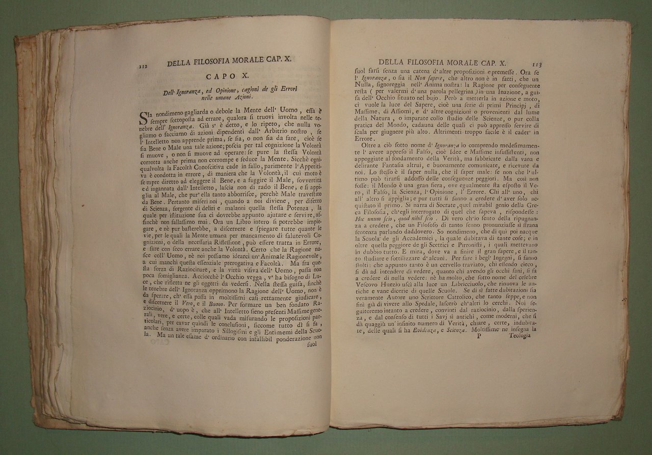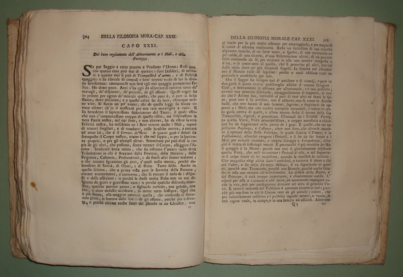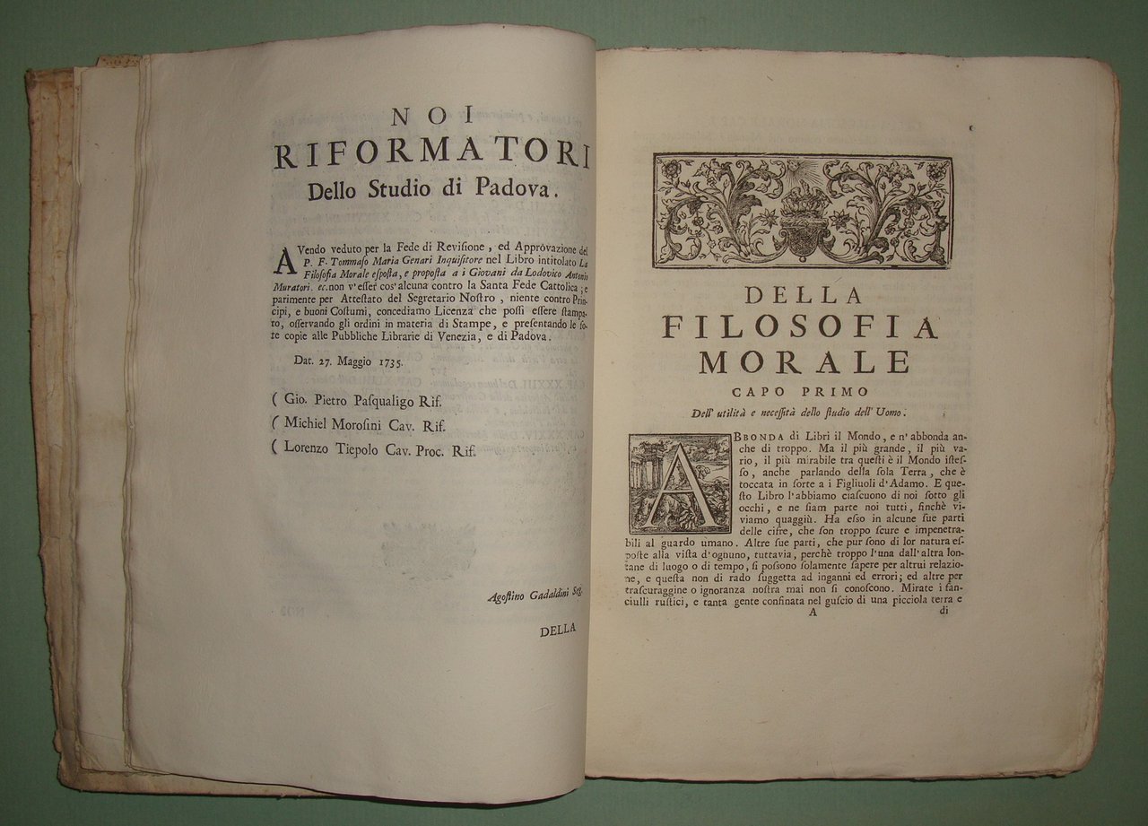 MURATORI Lodovico Antonio. La Filosofia Morale esposta e proposta ai giovani. Seconda edizione. In Verona, Targa, 1737. In 8vo; pp. 16n.nn, 452, XXX. Lievi fior. Cart.editoriale.