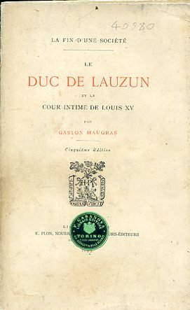 In-8°, pp. VII, 469, (3), brossura editoriale. Ritratto del Duca di Lauzun all'antiporta inciso in héliogravure e protetto da velina. Etichetta del tempo al piatto della libreria Casanova di Torino. Bell'esemplare. Quinta edizione, contemporanea alla prima che è dello stesso anno, di questa biografia di Armand Louis de Gontaut, Conte di Biron e poi Duca di Lauzun, famoso militare e cortigiano che fu capo della spedizione francese in Irlanda.