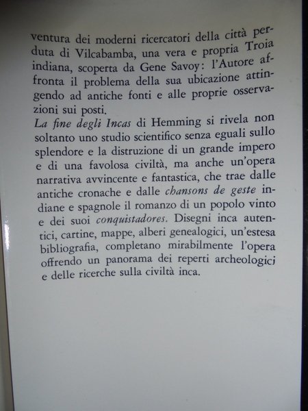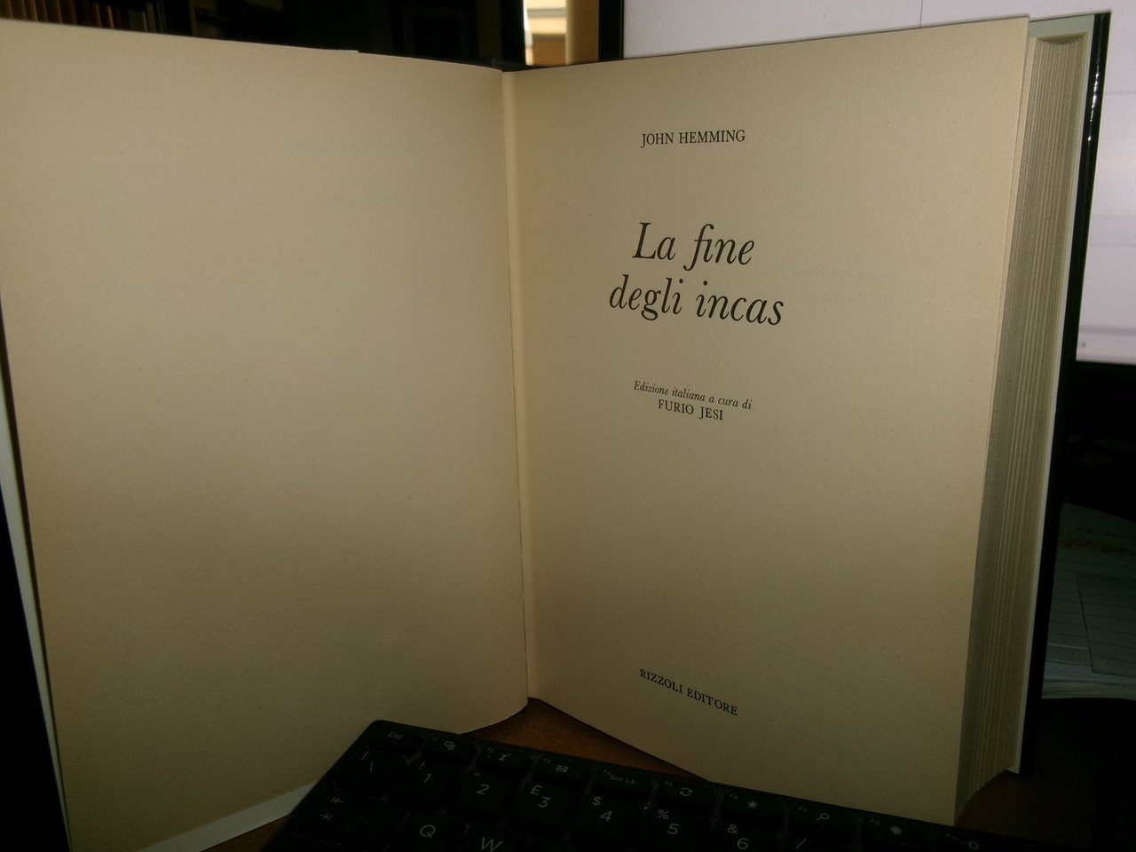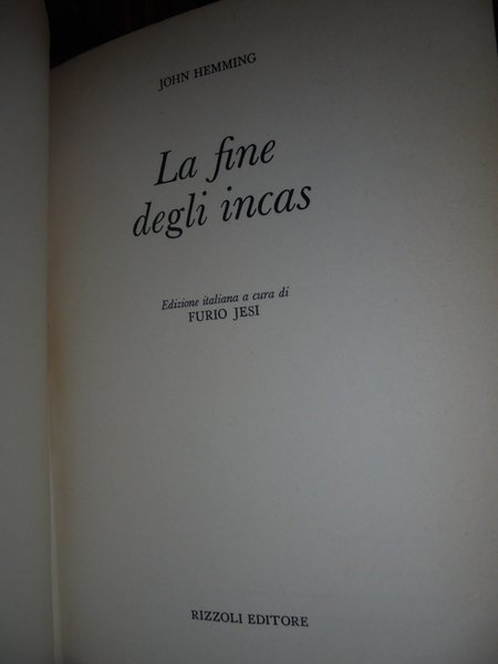 John Hemming - Milano, Rizzoli Editore, 1975. EDIZIONE ITALIANA A CURA DI FURIO JESI. IN- 8°, CARTONATO CON SOVRACOPERTINA ILL. A COLORI, 656 PP. CON MOLTE ILLUSTRAZIONI IN NERO NEL TESTO ED INNUMEREVOLI TAVOLE IN BIANCO E NERO FUORI TESTO. LA PIÙ COMPLETA RICOSTRUZIONE STORICA DELLO SPLENDORE DELLA CIVILTÀ INCAICA E DEI CONQUISTADORES CHE LA DISTRUSSERO. PRIMA EDIZIONE. Ottimo stato. Uff. C - I - 3