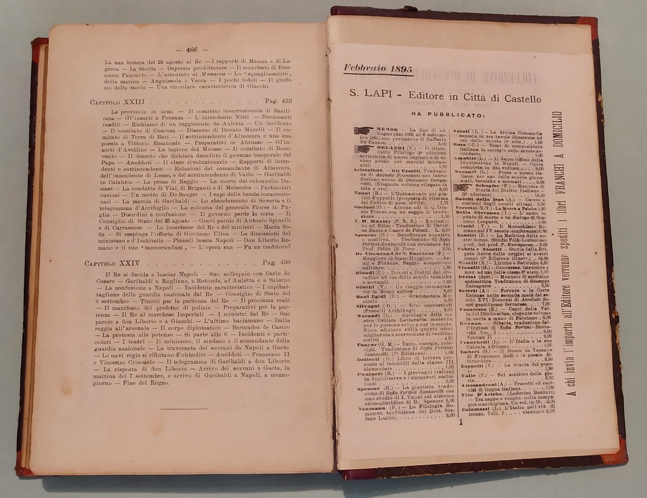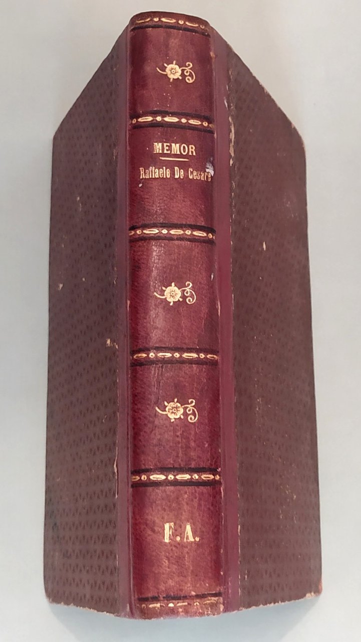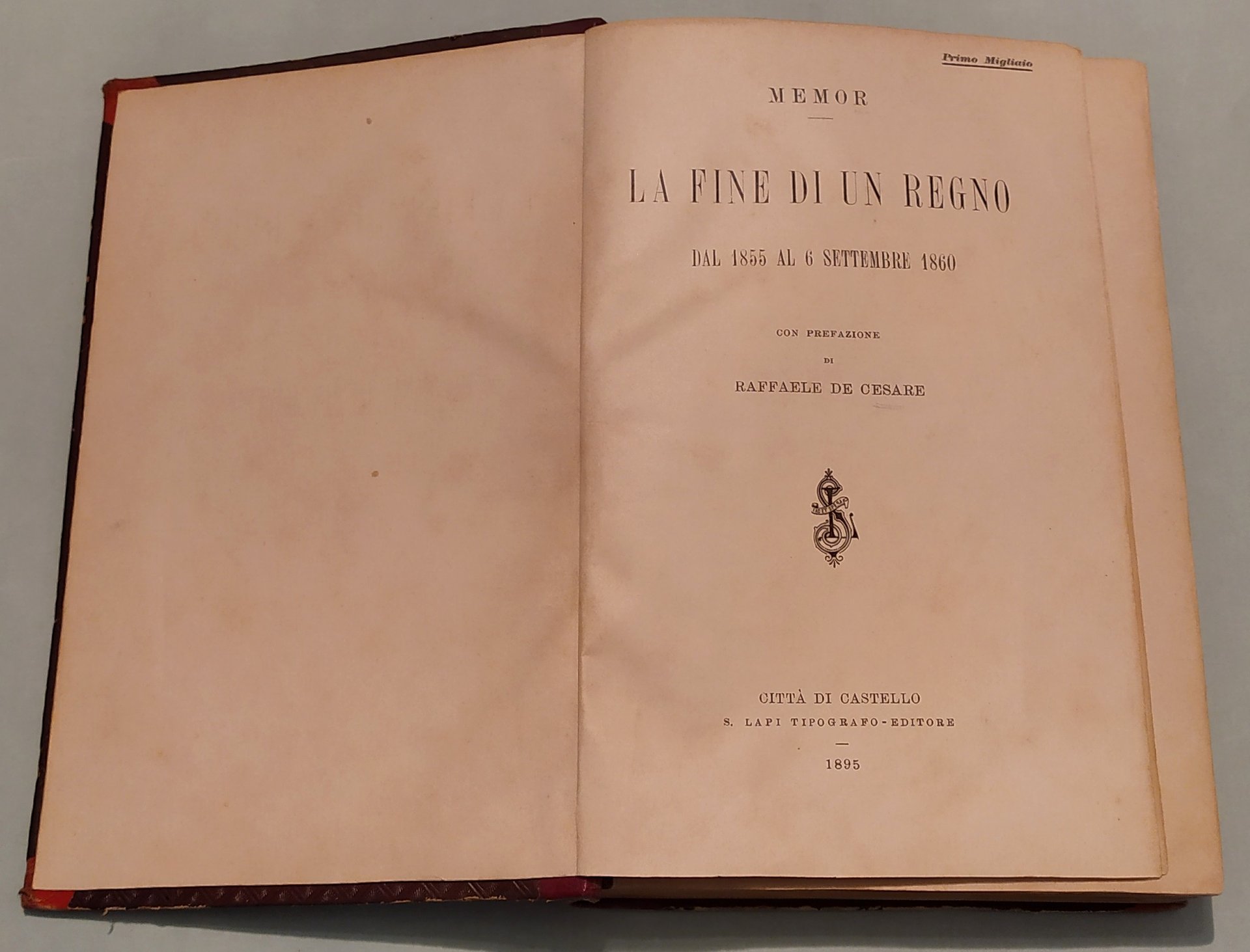 DE CESARE Raffaele (Memor). La Fine di un Regno. Dal 1855 al 1860. Città di Castello, Lapi, 1895. In 8vo; pp.XX, 486. Mezza pelle coeva, titolo e fregi in oro al dorso. Prima edizione, Memor è lo pseudonimo di Raffaele De Cesare.
