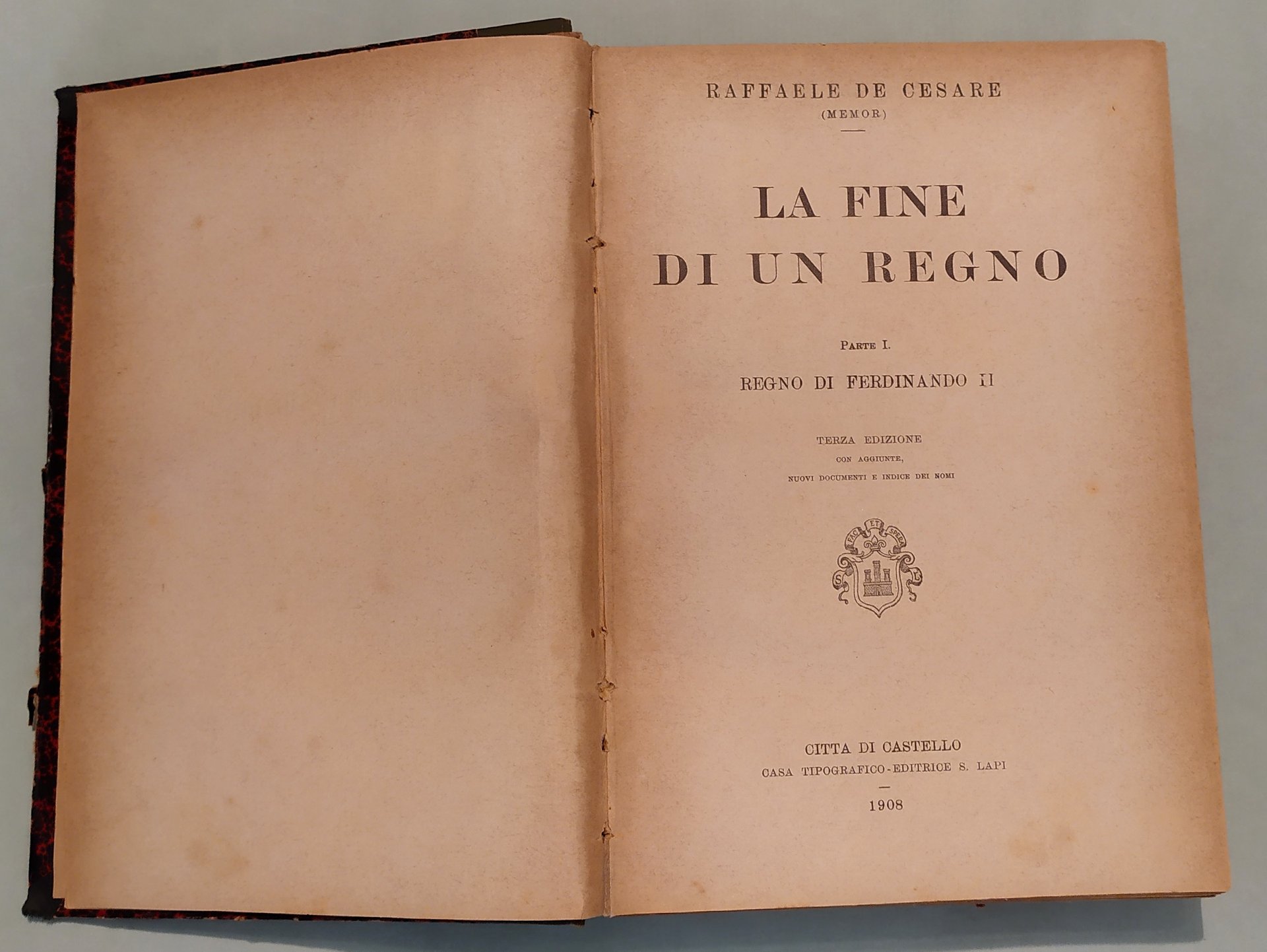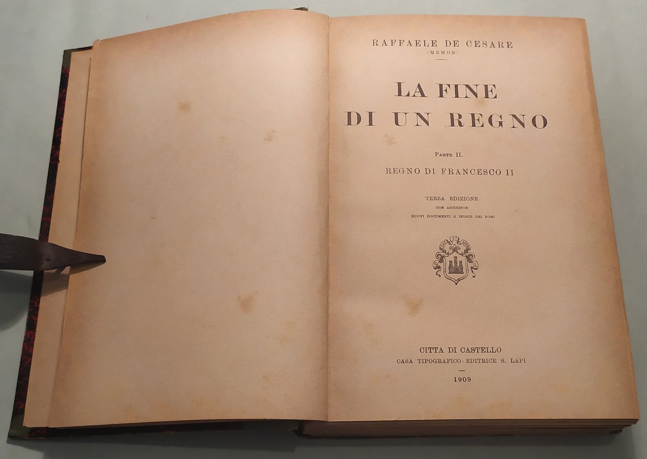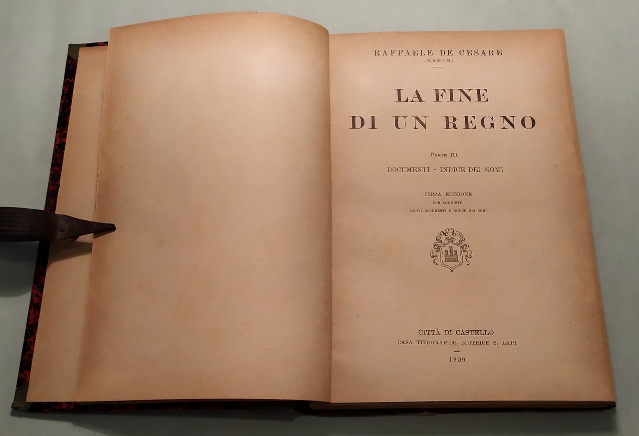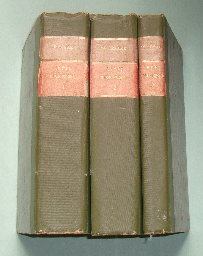 DE CESARE Raffaele. La fine di un Regno. Terza edizione con aggiunte, nuovi documenti e indice dei nomi. Città di Castello, Lapi, 1908 - 1909. Tre volumi in 8vo; pp. XII, 527; 477; 207. Mezza tela, tasselli ai dorsi con titolo in oro. Cerniere allentate.