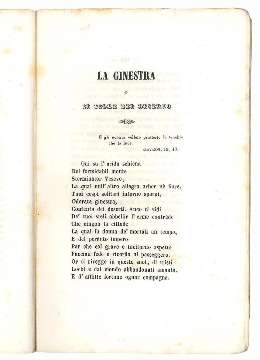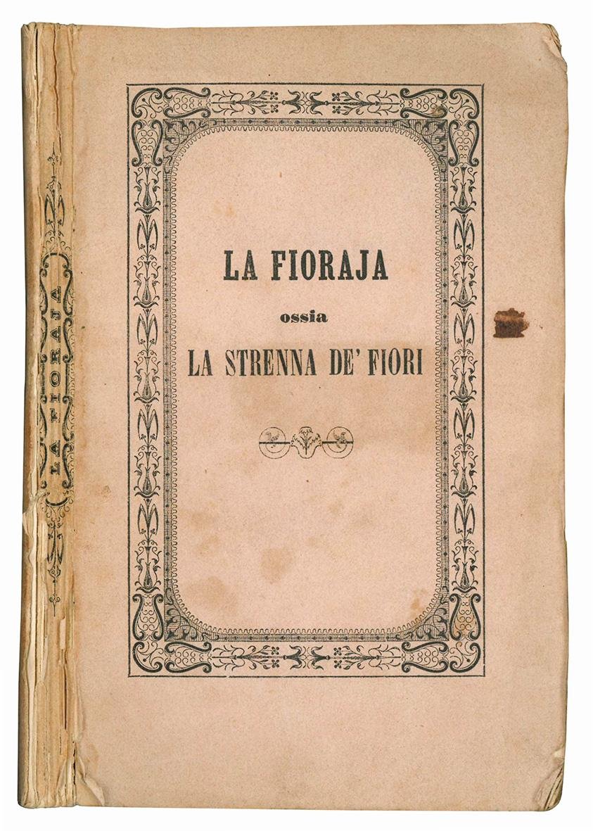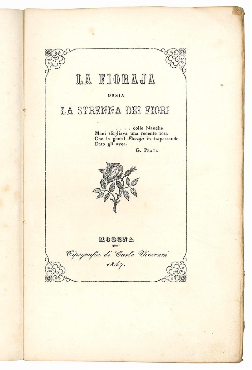 Prima edizione di questa Strenna modenese contenente composizioni dedicate a vari tipi di fiori fra le quali "La Ginestra" di Giacomo Leopardi e i celebri scherzi botanici del Cav. Ricci, oltre a numerosi componimenti di Antonio Peretti, noto poeta e letterato attivo presso le corti di Francesco IV e Francesco V di Modena, oltre che professore e segretario dell'Accademia Atesina di belle arti. Buono stato di conservazione, non comune. [Attributes: First Edition]