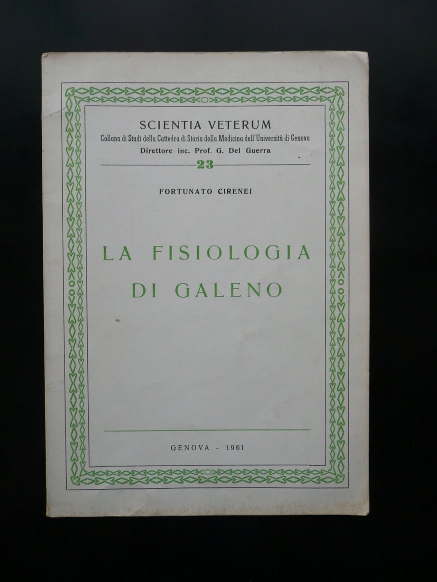 Fortunato Cirenei, Scientia Veterum" collana di studi della cattedra di Storia della Medicina dell'Università di Genova - La fisiologia di Galeno Università di Genova, Genova 1961, cm 24x17, pp. 68 con un ritratto in b/n di Galeno f. t.; brossura ed. Frontespizio con timbretto - ex libris del precedente proprietario. Condizioni di conservazione Esemplare in buone condizioni con tracce d'uso; brossura con alcune minime bruniture e qualche lievissimo alone; angoli delle br. con lievi tracce di pieghe. Interni buoni con una minima ammaccatura al margine inf. SETT89.L8065 N "