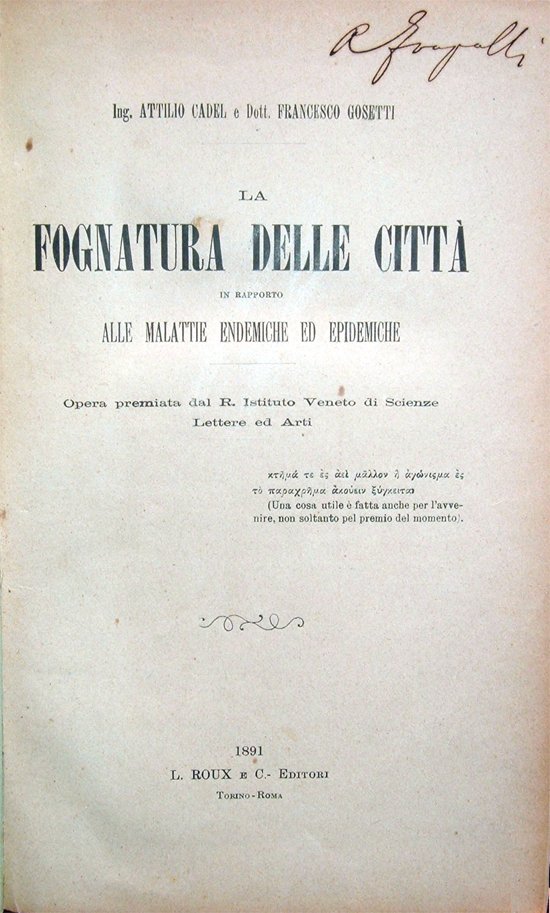 La fognatura delle città in rapporto alle malattie endemiche ed epidemiche. Opera premiata dal R. Istituto Veneto di Scienze, Lettere ed Arti