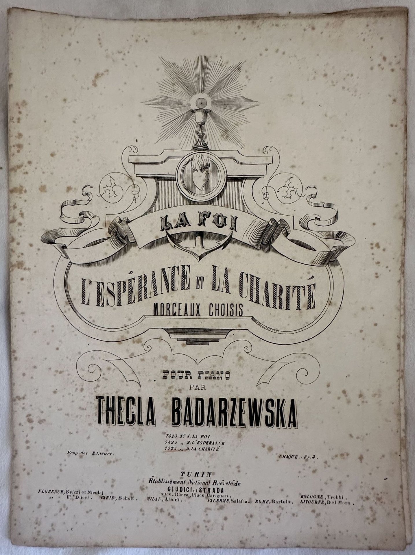 Edizione del 1870 circa della melodia "La charite"della compositrice polacca Tekla Badarzewska-Baranowska (1823-1861). Illustrazione in copertina. In buone condizioni. Copertina assente. Legatura editorialmente assente. Pagine in buone condizioni con fioriture. In Folio. cm. 34,5x25,5. Pp. 7.Edition of 1870 circa of the melody "La charite" by the polish composer Tekla Badarzewska-Baranowska (1823-1861). Illustration in the cover. In good conditions. Cover is missing. Binding almost lacks. Pages in good conditions with foxing. In Folio. cm. 34,5x25,5. Pp. 7.