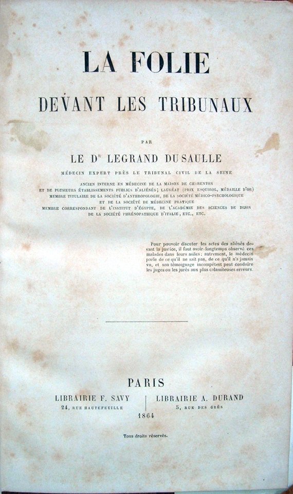 In-8°, pp. 624, legatura coeva in mezza tela con titoli in oro su tassello al dorso. Piccola firma d'appartenenza alla guardia anteriore. Qualche fioritura, per il resto ben conservato. Table des matières: Préface. Chapitre premier. De la législation romaine relative aux aliénés; Chap. II. L'aliéné devant la justice; Chap. III. L'aliéné devant le médecin expert; Chap. IV. Des intervalles lucides dans la folie et de leur appéciation juridique; Chap. V. Des testaments. § Ier. Des approches de la mort. De leur influence sur les facultés de l'intelligence et sur les actes de dernière volonté; § II. Des conditions mentales requises pour tester; § III. Des intervalles lucides. De leur application en matière de testaments; § IV. Exemples de testaments bizarres, de dispositions excentriques. Quelques testaments d'aliénés. Décisions de la justice; § V. De l'influence des congestions cérébrales et des attaques d'apoplexie sur la faculté de tester; § VI. De l'état de la jurisprudence en matière de testaments; Chap. VI. De l'ivresse. Du crime accompli par l'homme ivre et des questions médico-légales relatives au délire ébrieux; Chap. VII. Du somnambulisme naturel. Du crime et du suicide accomplis pendant le sommeil somnambulique; Chap. VIII. Du délire des pellagreux; Chap. IX. De l'anthropophagie; Chap. X. De l'hystérie; Chap. XI. De l'épilepsie; Chap. XII. De la monomanie incendiaire; Chap. XIII. De l'érotisme; Chap. XIV. De quelques influences susceptibles de compromettre la liberté morale; Chap. XV. De la nullité de mariage; Chap. XVI. Du témoignage des aliénés et de la valeur médico-légale de leurs aveux; Chap. XVII. De l'application de la photographie a l'étude des maladies mentales; Chap. XVIII. De la législation française relative aux aliénés.