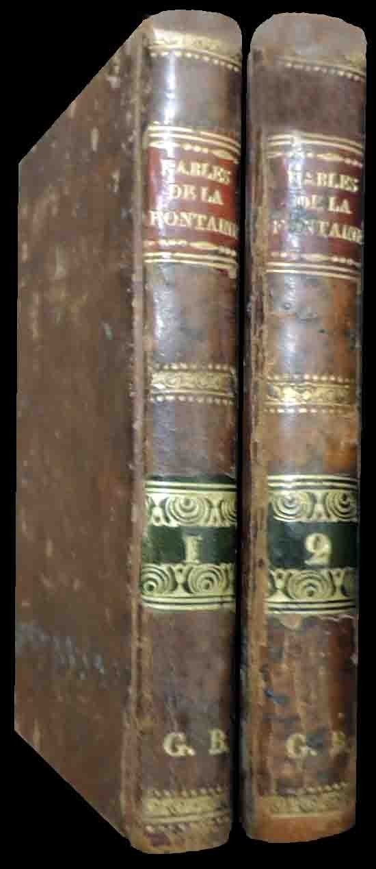 Fables de La Fontaine. Suivies d’Adonis, poeme, édition stéréotype d’apres le procédé de Firmin Didot, de l’imprimerie et de la fonderie stéréotypes de Pierre Didot l’ainé et de Firmin Didot, Paris an. VII 1799, 2 voll., pp. CXII, 392, testatine ill. b.n., cm 14, straordinaria legatura coeva in tutto vitello maculato con titoli e fregi in oro entro tasselli in marocchino rosso e verde al dorso, decorazioni in oro al taglio dei piatti e guardie in carta marmorizzata. Tome premier: pp. CXII, 136. Tome second: pp. 256. Pubblicazione in lingua francese. Una dedica a china al controfrontespizio del primo tomo. Leggere tracce d’uso, lievi abrasioni ai dorsi e ai margini dei piatti, minime bruniture, ma nel complesso volumi ben conservati, impreziositi da solide e belle legature d’epoca.