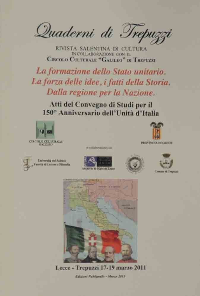 La formazione dello Stato unitario. La forza delle idee, i fatti della Storia. Dalla regione per la Nazione. Atti del Convegno di Studi per il 150° Anniversario dell’Unità d’Italia, Lecce-Trepuzzi, 17-19 marzo 2011, Edizioni Publigrafic, Trepuzzi (Lecce) 2013, pp. 401, ill. b.n., cm 24, br. ed. Numero speciale dei Quaderni di Trepuzzi. Rivista salentina di cultura, in collaborazione con il Circolo Culturale Galileo di Trepuzzi. Sommario: Raffaele Colapieta, La formazione dello Stato unitario. La forza delle idee, i fatti della Storia. Dalla regione per la Nazione – Roberto Martucci, La politica italiana di Cavour – Marco Veglia, Massoneria e letteratura nel Risorgimento: Carducci e la religione della patria – Sandra Covino, Le radici a ogni osto: falsi letterari e Risorgimento – Egidio Zacheo Unità d’Italia, centralismo, Mezzogiorno – Maria Sofia Corciulo, La Rivoluzione costituzionale del 1820-21 – Bruno Pellegrino, Chiesa borbonica e chiesa unitario – Andrea Frediani, La guerra di Novara. Problemi tattico-strategici della campagna militare più disastrosa del futuro esercito italiano – Gianni Donno, Il Sud e l’Unità – Salvatore De Masi, A scuola di Unità – Mario Marti, La poesia patriottica del Risorgimento italiano – Marco Leone, A proposito di un libro di M. Biondi: Letteratura e patria da Vittorio Alfieri a Ferdinando Martini – Pantaleo Palmieri, A proposito di un libro di Marino Biondi: La tradizione della patria II. Carduccianesimo e storia d’Italia – Marino Biondi, Antigiolittismo d’élite fino alla Grande Guerra – Mario De marco, Un protagonista del Risorgimento salentino: Giuseppe Libertini – Franca Tondo, Cronaca di un’unificazioe: la reazione antiunitaria nel Salento fra luglio e dicembre del 1860 – Antonio Salvatore Elia, Sette segrete a Trepuzzi e dintorni – Nicola Calso, La moneta dalla Grecia all’Unità d’Italia – Giacomo Fronzi, Il ruolo delle arti nel Risorgimento. Francesco Hayez, Gioacchino Toma e Giuseppe Verdi – Alessandro Laporta, Sigismondo Castromediano in Michele Saponaro. Perfetto.