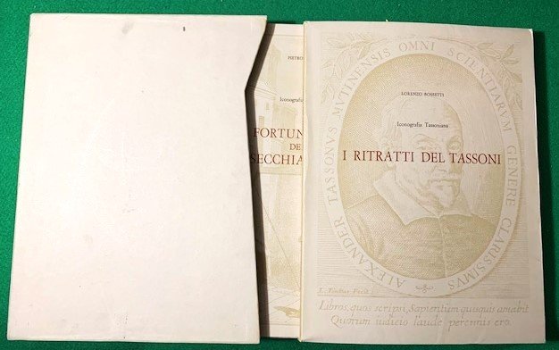 In 4° grande (43 cm); 2 vol.: 324, (4) pp. e con le riproduzioni di tutte le tavole delle edizioni illustrate della Secchia Rapita (CX tavole) e 116, (2) pp. con le riproduzioni di ritratti del Tassoni (XLVII tavole). Astuccio editoriale in cartoncino rigido. Sopraccoperte editoriali illustrate. Esemplare in buone-ottime condizioni di conservazione. Lo studio più importante mai realizzato sull'iconografia tassoniana e la più importante bibliografia sulle edizioni tassoniane.