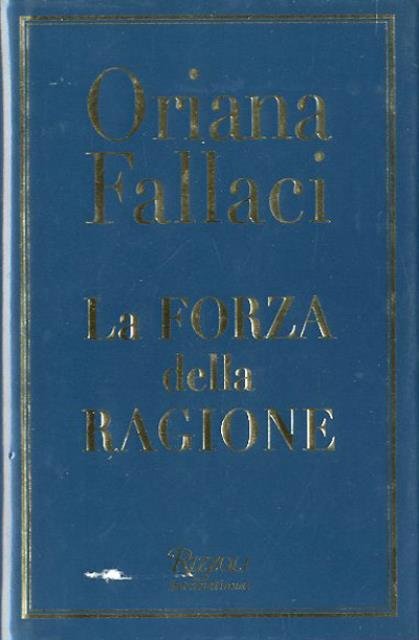 10. ed. 279 p. ; 21 x 14 cm. «La Forza della Ragione» è il secondo libro de "La Trilogia" di Oriana Fallaci (gli altri due sono «La rabbia e l'orgoglio» e «Oriana Fallaci intervista sé stessa»). In questo libro, inizialmente concepito come un post scriptum per la trentesima edizione de «La rabbia e l'orgoglio», la giornalista-scrittrice risponde con determinazione ai violenti attacchi ricevuti da gruppi islamici, da gruppi politici facenti riferimento per la maggior parte alla sinistra e dai mass media a seguito della pubblicazione del volume del 2001. Il libro termina con questa frase: «Stavolta non mi appello alla rabbia, all'orgoglio, alla passione. Mi appello alla Ragione. E insieme a Mastro Cecco che di nuovo sale sul rogo acceso dall'irragionevolezza ti dico: bisogna ritrovare la Forza della Ragione». Cecco d'Ascoli, noto anche come Mastro Cecco, alla cui figura l'autrice si richiama, è un ascolano che, condannato per eresia dal Sant'Uffizio, fu bruciato vivo sul rogo a Firenze nel 1328 secondo quanto riporta la Fallaci, insieme alle copie del suo saggio «La Sfera Armillare». Il libro è dedicato a Fabrizio Quattrocchi e agli italiani vittime dell'estremismo religioso. Legatura editoriale, coperta in cartone rigido di colore grigio con impresso il titolo in oro al dorso e al piatto. Sovraccoperta in carta patinata lucida di colore blu anche con impresso il titolo in oro al dorso e al piatto. Codice libreria 5012.
