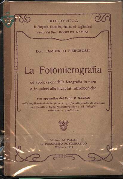 In 16, br. ed.pp. 382, rare ill. in n. n. t. , con appendice del prof. R.Namias sulle applicazioni della fotomicrografia allo studio di struttura dei metalli e leghe(metallurgiche) e ad indagini chimiche e giudiziarie; piatto ant. staccatoe con tracce di nastro adesivo, dorso brunito, firma d'appartenenza in frontespizio, interno comunque in buono stato.Luogo di pubblicazione MilanoEditore Il progresso fotograficoAnno pubblicazione 1914Collana Biblioteca di fotografia Scientifica, Pratica ed ApplicazioniMateria/Argomento Fotografia, Applicazioni alla fotografia