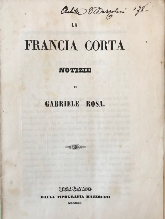 In-8° (cm. 22,6), brossura muta coeva verde, pp. 46 [2] in buono stato, ultimo foglio con errata al verso, firma di appartenenza al margine del frontespizio del letterato bergamasco Achille Mazzoleni (1878); lievi fioriture sparse. Edizione originale di una delle prime pubblicazioni sulla Franciacorta, «ondata di colline succedentisi variamente alle falde degli estremi lembi dell'Alpi retiche verso il piano tra Brescia e l'Olio [.]» [p.4]. Esemplare molto buono. (SP1)